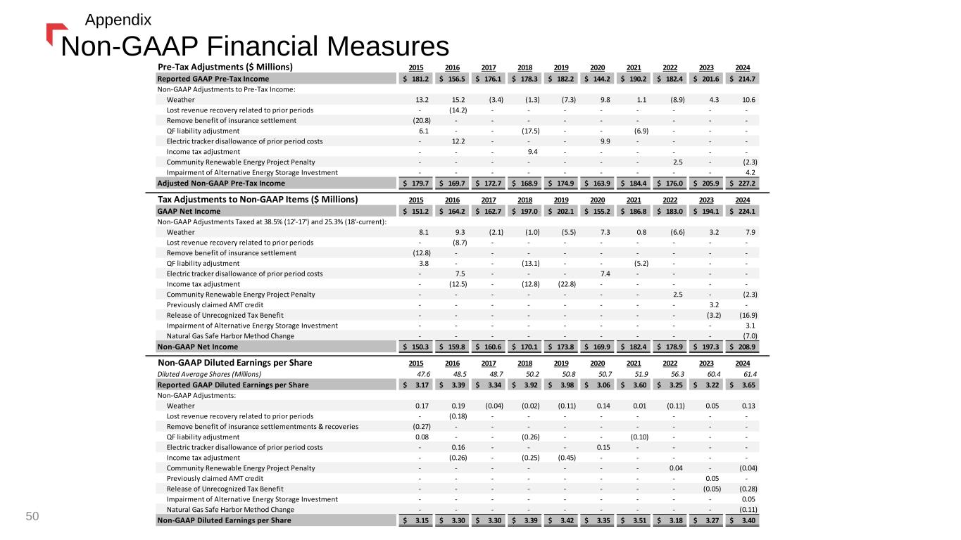 Non-GAAP Financial Measures 50 Appendix Pre-Tax Adjustments ($ Millions) 2015 2016 2017 2018 2019 2020 2021 2022 2023 2024 Reported GAAP Pre-Tax Income 181.2$ 156.5$ 176.1$ 178.3$ 182.2$ 144.2$ 190.2$ 182.4$ 201.6$ 214.7$ Non-GAAP Adjustments to Pre-Tax Income: Weather 13.2 15.2 (3.4) (1.3) (7.3) 9.8 1.1 (8.9) 4.3 10.6 Lost revenue recovery related to prior periods - (14.2) - - - - - - - - Remove benefit of insurance settlement (20.8) - - - - - - - - - QF liability adjustment 6.1 - - (17.5) - - (6.9) - - - Electric tracker disallowance of prior period costs - 12.2 - - - 9.9 - - - - Income tax adjustment - - - 9.4 - - - - - - Community Renewable Energy Project Penalty - - - - - - - 2.5 - (2.3) Impairment of Alternative Energy Storage Investment - - - - - - - - - 4.2 Adjusted Non-GAAP Pre-Tax Income 179.7$ 169.7$ 172.7$ 168.9$ 174.9$ 163.9$ 184.4$ 176.0$ 205.9$ 227.2$ Tax Adjustments to Non-GAAP Items ($ Millions) 2015 2016 2017 2018 2019 2020 2021 2022 2023 2024 GAAP Net Income 151.2$ 164.2$ 162.7$ 197.0$ 202.1$ 155.2$ 186.8$ 183.0$ 194.1$ 224.1$ Non-GAAP Adjustments Taxed at 38.5% (12'-17') and 25.3% (18'-current): Weather 8.1 9.3 (2.1) (1.0) (5.5) 7.3 0.8 (6.6) 3.2 7.9 Lost revenue recovery related to prior periods - (8.7) - - - - - - - - Remove benefit of insurance settlement (12.8) - - - - - - - - - QF liability adjustment 3.8 - - (13.1) - - (5.2) - - - Electric tracker disallowance of prior period costs - 7.5 - - - 7.4 - - - - Income tax adjustment - (12.5) - (12.8) (22.8) - - - - - Community Renewable Energy Project Penalty - - - - - - - 2.5 - (2.3) Previously claimed AMT credit - - - - - - - - 3.2 - Release of Unrecognized Tax Benefit - - - - - - - - (3.2) (16.9) Impairment of Alternative Energy Storage Investment - - - - - - - - - 3.1 Natural Gas Safe Harbor Method Change - - - - - - - - - (7.0) Non-GAAP Net Income 150.3$ 159.8$ 160.6$ 170.1$ 173.8$ 169.9$ 182.4$ 178.9$ 197.3$ 208.9$ Non-GAAP Diluted Earnings per Share 2015 2016 2017 2018 2019 2020 2021 2022 2023 2024 Diluted Average Shares (Millions) 47.6 48.5 48.7 50.2 50.8 50.7 51.9 56.3 60.4 61.4 Reported GAAP Diluted Earnings per Share 3.17$ 3.39$ 3.34$ 3.92$ 3.98$ 3.06$ 3.60$ 3.25$ 3.22$ 3.65$ Non-GAAP Adjustments: Weather 0.17 0.19 (0.04) (0.02) (0.11) 0.14 0.01 (0.11) 0.05 0.13 Lost revenue recovery related to prior periods - (0.18) - - - - - - - - Remove benefit of insurance settlementments & recoveries (0.27) - - - - - - - - - QF liability adjustment 0.08 - - (0.26) - - (0.10) - - - Electric tracker disallowance of prior period costs - 0.16 - - - 0.15 - - - - Income tax adjustment - (0.26) - (0.25) (0.45) - - - - - Community Renewable Energy Project Penalty - - - - - - - 0.04 - (0.04) Previously claimed AMT credit - - - - - - - - 0.05 - Release of Unrecognized Tax Benefit - - - - - - - - (0.05) (0.28) Impairment of Alternative Energy Storage Investment - - - - - - - - - 0.05 Natural Gas Safe Harbor Method Change - - - - - - - - - (0.11) Non-GAAP Diluted Earnings per Share 3.15$ 3.30$ 3.30$ 3.39$ 3.42$ 3.35$ 3.51$ 3.18$ 3.27$ 3.40$