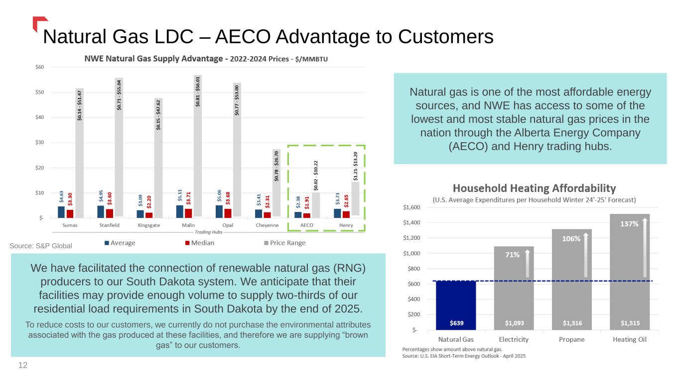 • Investment in production*, transmission, & distribution • Extreme winters necessitate economical gas heating • Energy Choice (Ban the Ban) laws in MT, SD, & NE • Access to low & less volatile natural gas pricing • AECO & Henry Hub (Ventura) *Proven and producing reserves only (no exploration) NorthWestern’s Combo Advantage 11 ✓ Combination electric & natural gas provider in Montana & South Dakota (natural gas only in Nebraska) • Targeting best-in-class Customer Experience • Opportunity to invest in critical Capacity expansion (supply & transmission) • Continued Grid Evolution to improve resiliency and enhance wildfire mitigation efforts • Transforming our Digital Platform to enhance cyber-security & technology solutions ✓ Natural hedge between natural gas to electric conversions ✓ Primarily residential with commercial & industrial customers across many industries • Investment in generation, transmission, & distribution • Highly diverse & carbon-free electric supply portfolio • Broad footprint spanning multiple reliability & transmission regions / organizations • Growing regional capacity deficit requiring investment ElectricNatural Gas Source: Western Electric Coordinating Council (WECC)