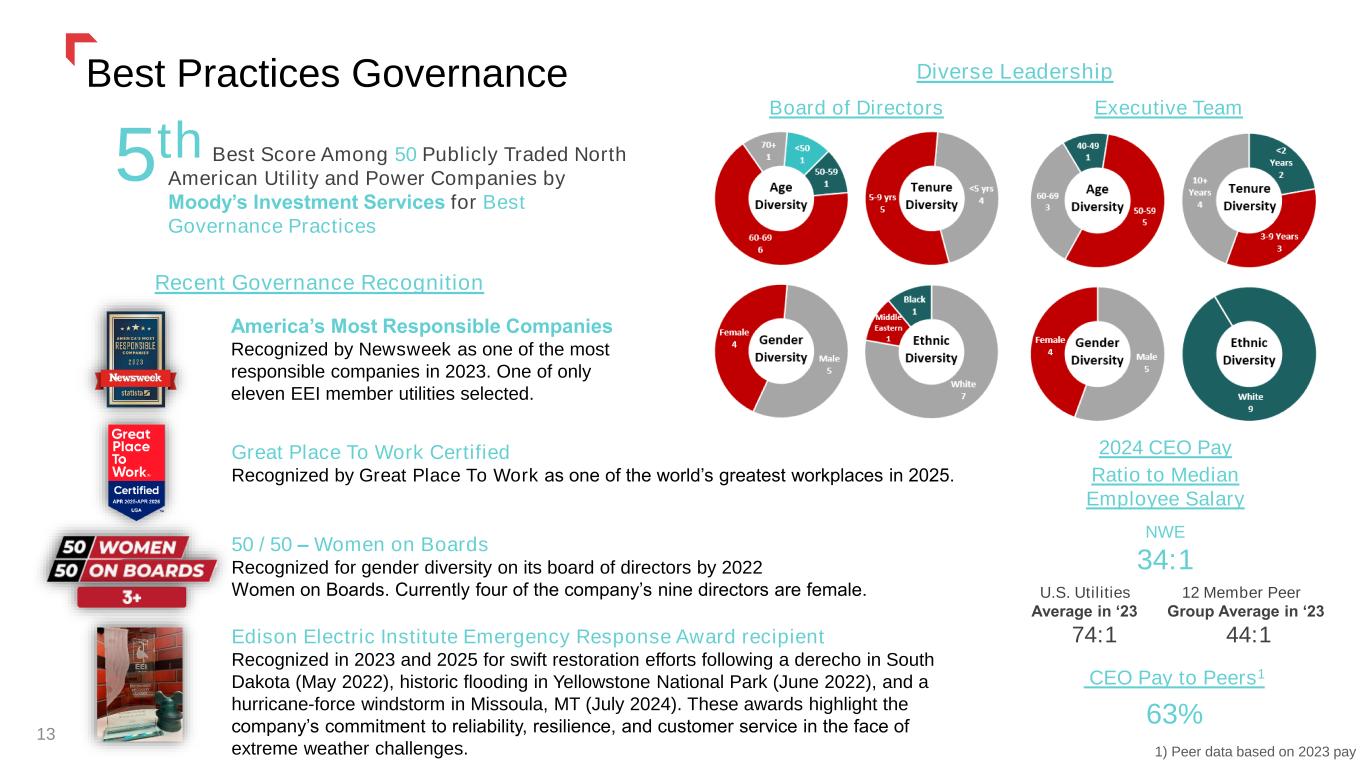 Best Practices Governance 13 America’s Most Responsible Companies Recognized by Newsweek as one of the most responsible companies in 2023. One of only eleven EEI member utilities selected. Board of Directors Executive Team 5th Best Score Among 50 Publicly Traded North American Utility and Power Companies by Moody’s Investment Services for Best Governance Practices Diverse Leadership 2024 CEO Pay Ratio to Median Employee Salary NWE 34:1 U.S. Utilities 12 Member Peer Average in ‘23 Group Average in ‘23 74:1 44:1 CEO Pay to Peers1 63% Recent Governance Recognition Great Place To Work Certified Recognized by Great Place To Work as one of the world’s greatest workplaces in 2025. 50 / 50 – Women on Boards Recognized for gender diversity on its board of directors by 2022 Women on Boards. Currently four of the company’s nine directors are female. Edison Electric Institute Emergency Response Award recipient Recognized in 2023 and 2025 for swift restoration efforts following a derecho in South Dakota (May 2022), historic flooding in Yellowstone National Park (June 2022), and a hurricane-force windstorm in Missoula, MT (July 2024). These awards highlight the company’s commitment to reliability, resilience, and customer service in the face of extreme weather challenges. 1) Peer data based on 2023 pay