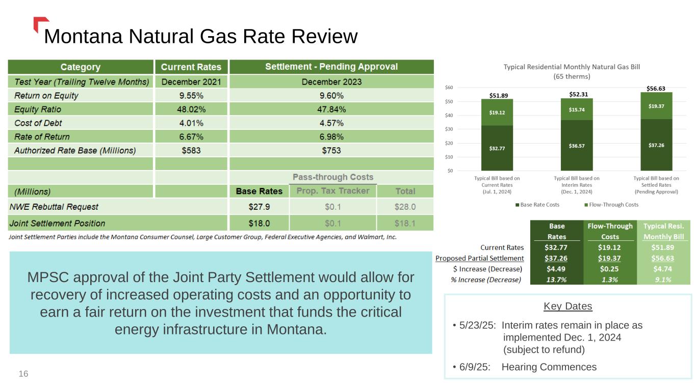 15 Montana Electric Rate Review MPSC approval of the partial Joint Party Settlement, along with NorthWestern’s proposals for YCGS and PCCAM, would allow for recovery of increased operating costs and an opportunity to earn a fair return on the investment that funds the critical energy infrastructure in Montana. Key Dates • 5/23/25: Implementation of initially filed rates (subject to refund) • 6/9/25: Hearing Commences