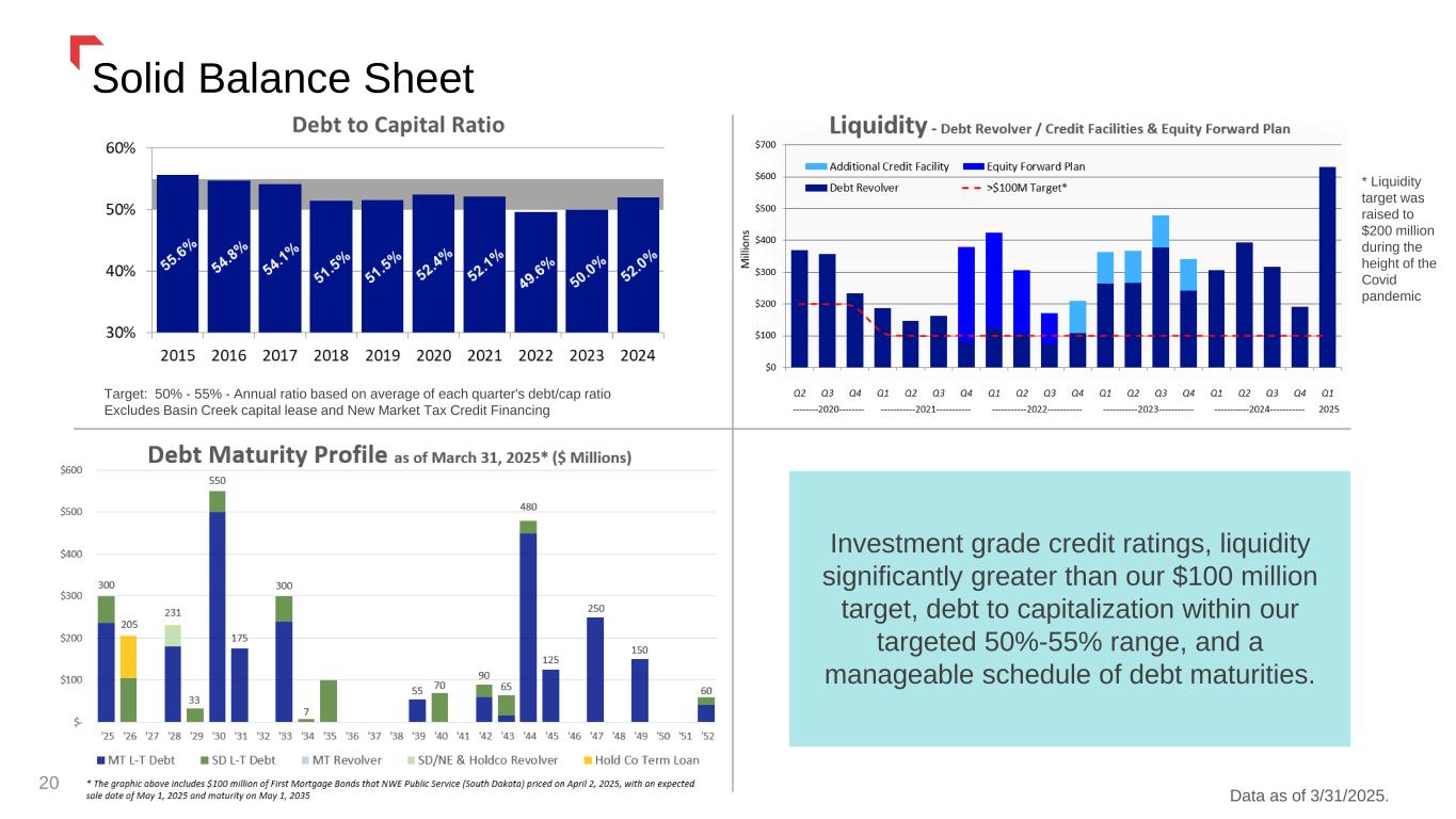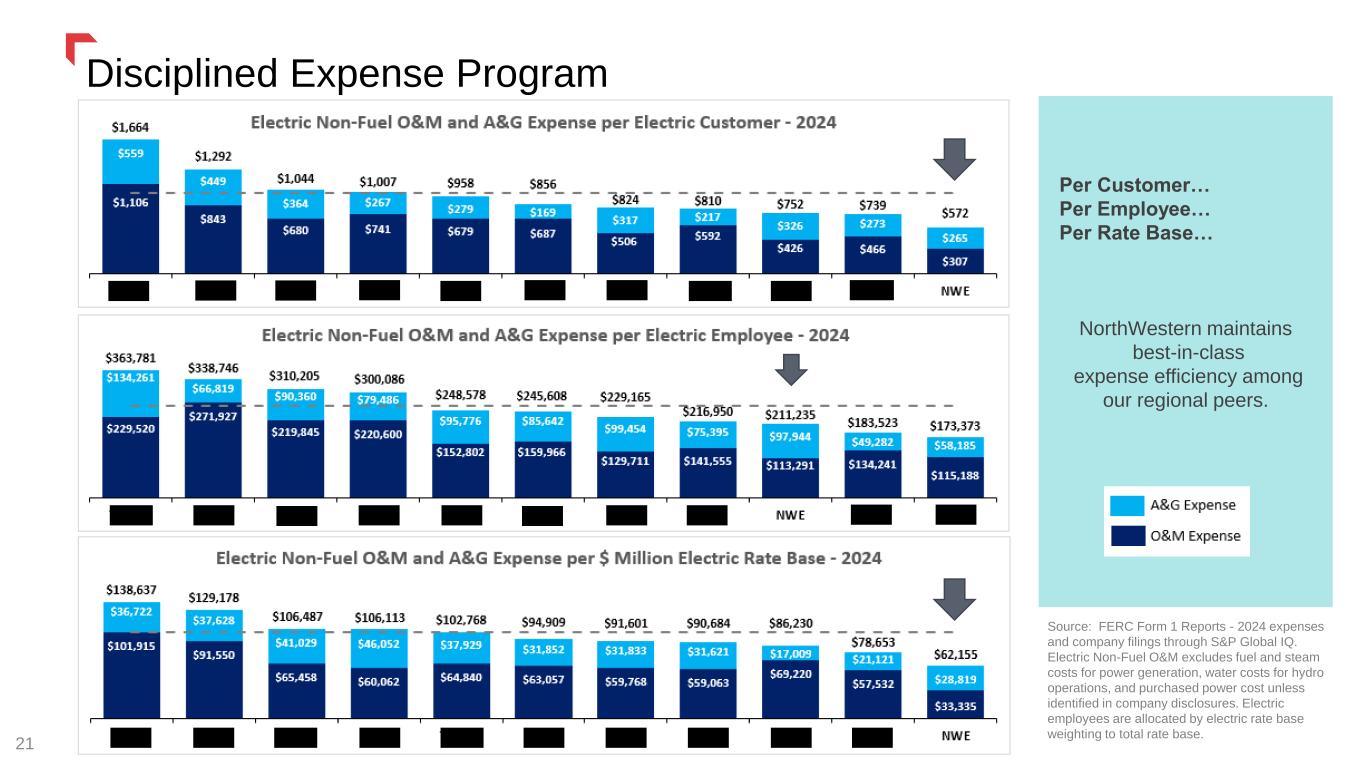 Solid Balance Sheet 20 Investment grade credit ratings, liquidity significantly greater than our $100 million target, debt to capitalization within our targeted 50%-55% range, and a manageable schedule of debt maturities. * Liquidity target was raised to $200 million during the height of the Covid pandemic Target: 50% - 55% - Annual ratio based on average of each quarter's debt/cap ratio Excludes Basin Creek capital lease and New Market Tax Credit Financing Data as of 3/31/2025.