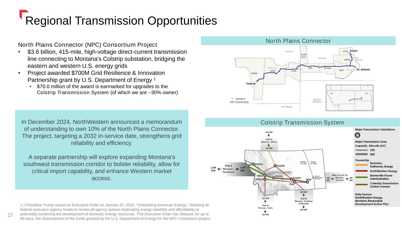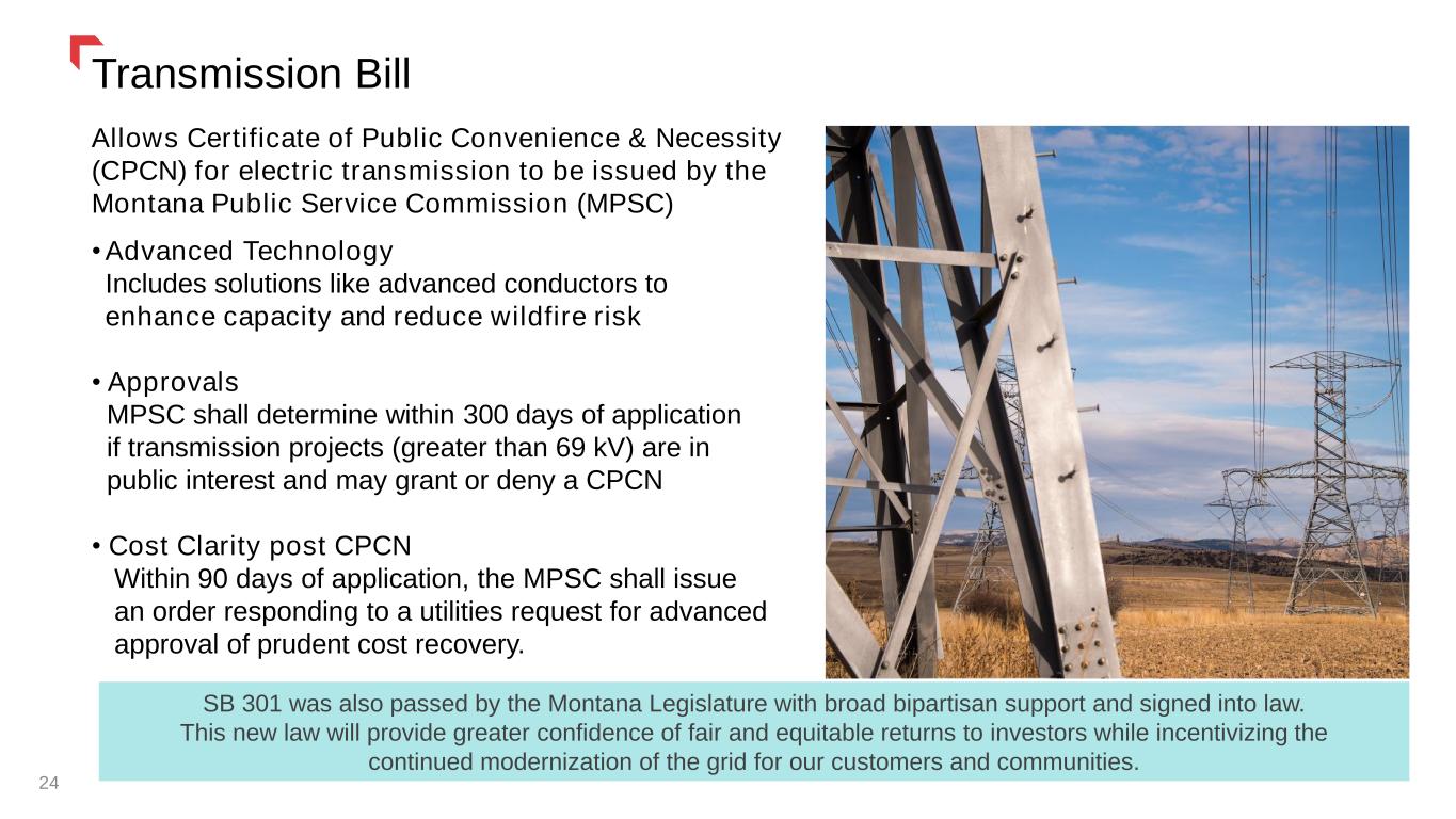 24 Transmission Bill Allows Certificate of Public Convenience & Necessity (CPCN) for electric transmission to be issued by the Montana Public Service Commission (MPSC) • Advanced Technology Includes solutions like advanced conductors to enhance capacity and reduce wildfire risk • Approvals MPSC shall determine within 300 days of application if transmission projects (greater than 69 kV) are in public interest and may grant or deny a CPCN • Cost Clarity post CPCN Within 90 days of application, the MPSC shall issue an order responding to a utilities request for advanced approval of prudent cost recovery. SB 301 was also passed by the Montana Legislature with broad bipartisan support and signed into law. This new law will provide greater confidence of fair and equitable returns to investors while incentivizing the continued modernization of the grid for our customers and communities.