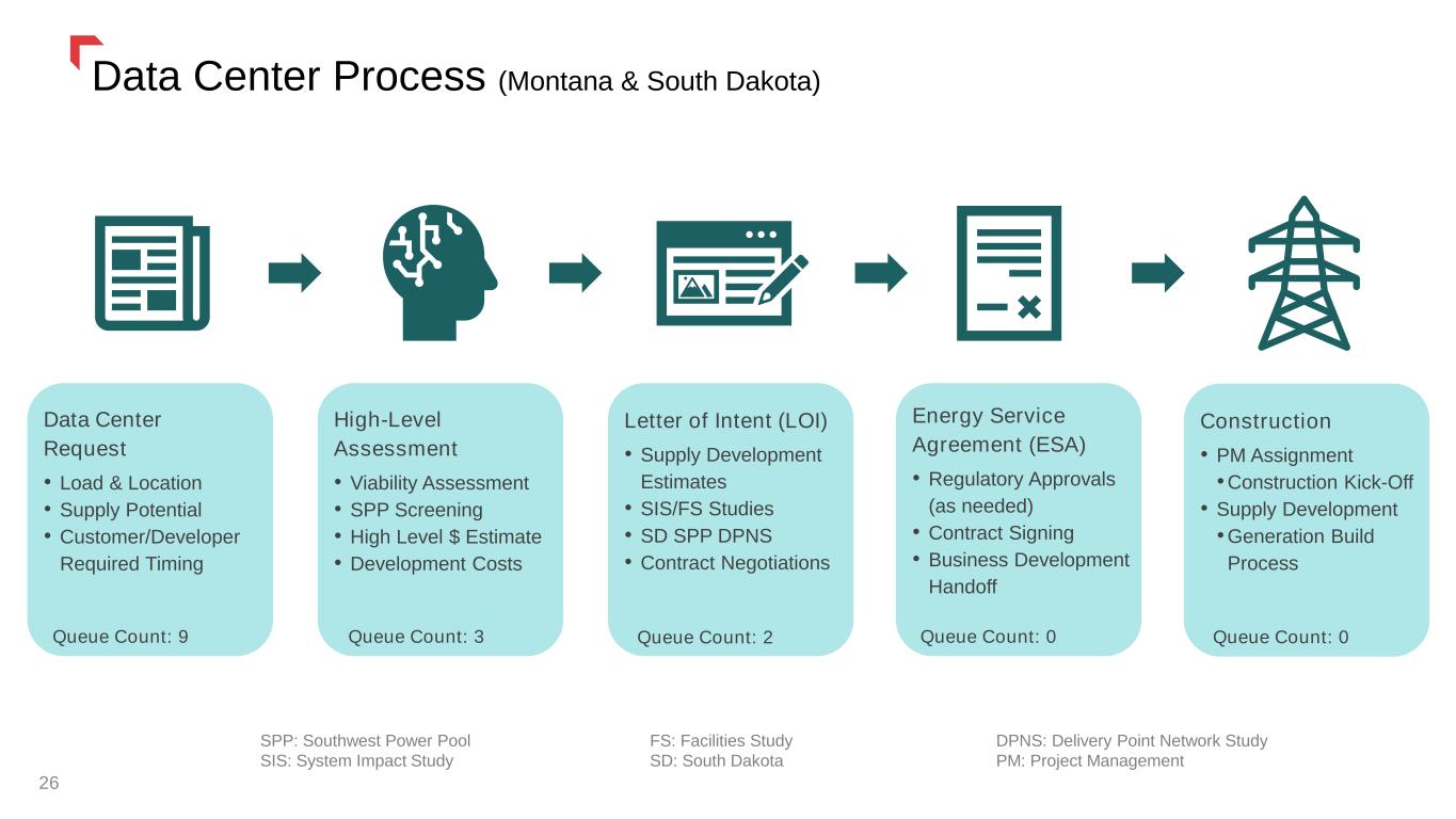 26 Data Center Process (Montana & South Dakota) Data Center Request • Load & Location • Supply Potential • Customer/Developer Required Timing High-Level Assessment • Viability Assessment • SPP Screening • High Level $ Estimate • Development Costs Letter of Intent (LOI) • Supply Development Estimates • SIS/FS Studies • SD SPP DPNS • Contract Negotiations Energy Service Agreement (ESA) • Regulatory Approvals (as needed) • Contract Signing • Business Development Handoff Construction • PM Assignment • Construction Kick-Off • Supply Development • Generation Build Process SPP: Southwest Power Pool SIS: System Impact Study FS: Facilities Study SD: South Dakota DPNS: Delivery Point Network Study PM: Project Management Queue Count: 9 Queue Count: 3 Queue Count: 2 Queue Count: 0 Queue Count: 0