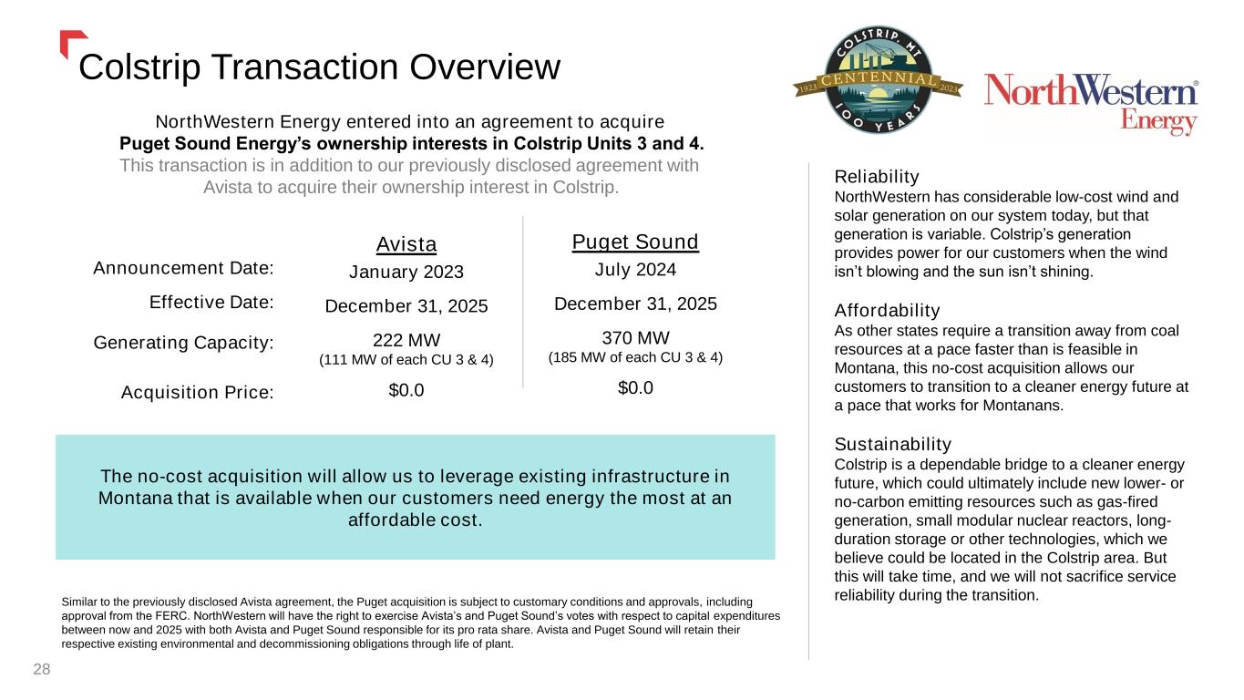 Regional Transmission Opportunities 27 Colstrip Transmission System North Plains Connector (NPC) Consortium Project • $3.6 billion, 415-mile, high-voltage direct-current transmission line connecting to Montana's Colstrip substation, bridging the eastern and western U.S. energy grids • Project awarded $700M Grid Resilience & Innovation Partnership grant by U.S. Department of Energy 1 • $70.0 million of the award is earmarked for upgrades to the Colstrip Transmission System (of which we are ~30% owner) North Plains Connector In December 2024, NorthWestern announced a memorandum of understanding to own 10% of the North Plains Connector. The project, targeting a 2032 in-service date, strengthens grid reliability and efficiency. A separate partnership will explore expanding Montana's southwest transmission corridor to bolster reliability, allow for critical import capability, and enhance Western market access. 1.) President Trump issued an Executive Order on January 20, 2025, "Unleashing American Energy," directing all federal executive agency heads to review all agency actions implicating energy reliability and affordability or potentially burdening the development of domestic energy resources. This Executive Order has delayed, for up to 90 days, the disbursement of the funds granted by the U.S. Department of Energy for the NPC Consortium project. 27