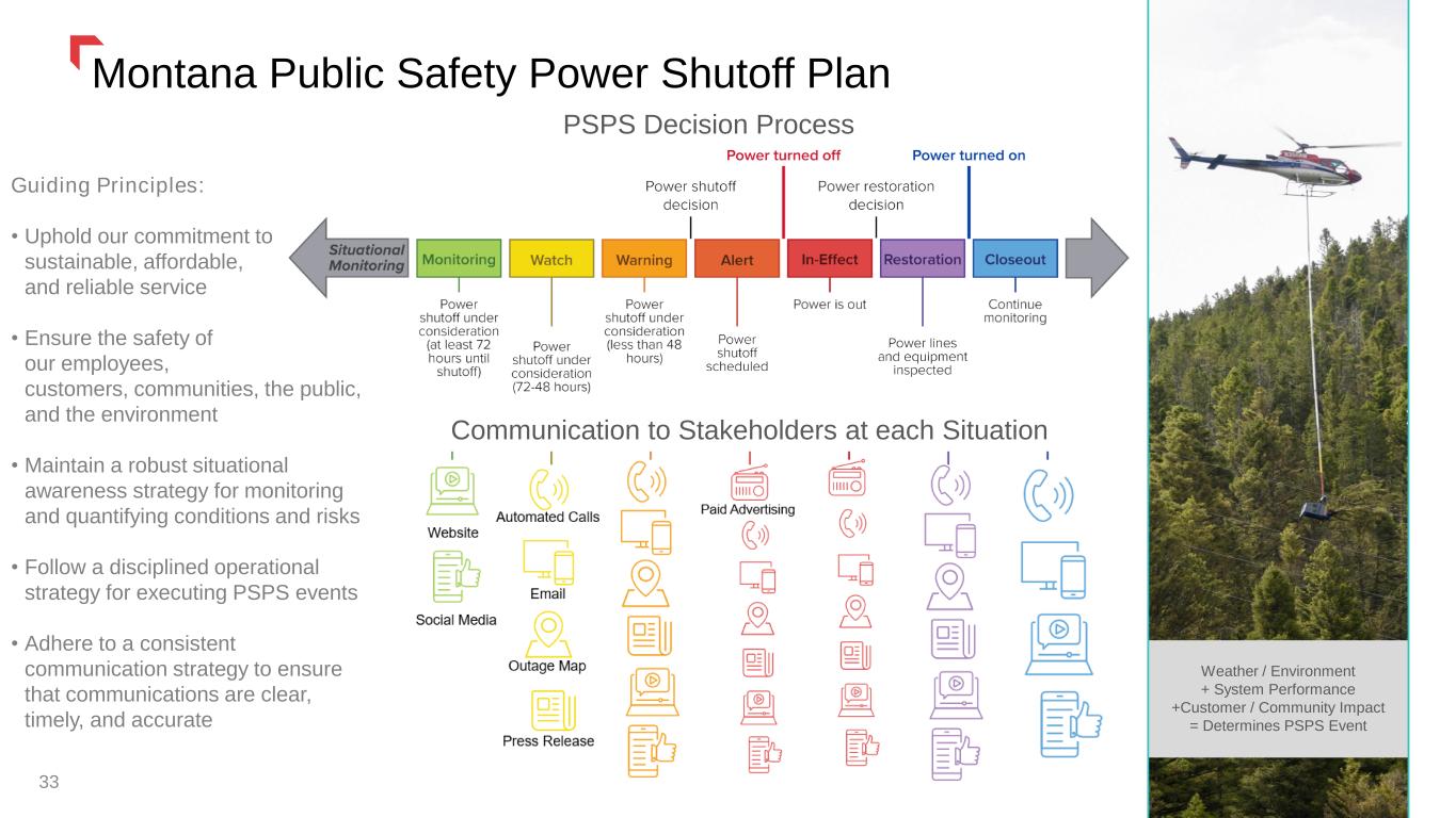 Montana Public Safety Power Shutoff Plan Communication to Stakeholders at each Situation Weather / Environment + System Performance +Customer / Community Impact = Determines PSPS Event PSPS Decision Process 33 Guiding Principles: • Uphold our commitment to sustainable, affordable, and reliable service • Ensure the safety of our employees, customers, communities, the public, and the environment • Maintain a robust situational awareness strategy for monitoring and quantifying conditions and risks • Follow a disciplined operational strategy for executing PSPS events • Adhere to a consistent communication strategy to ensure that communications are clear, timely, and accurate