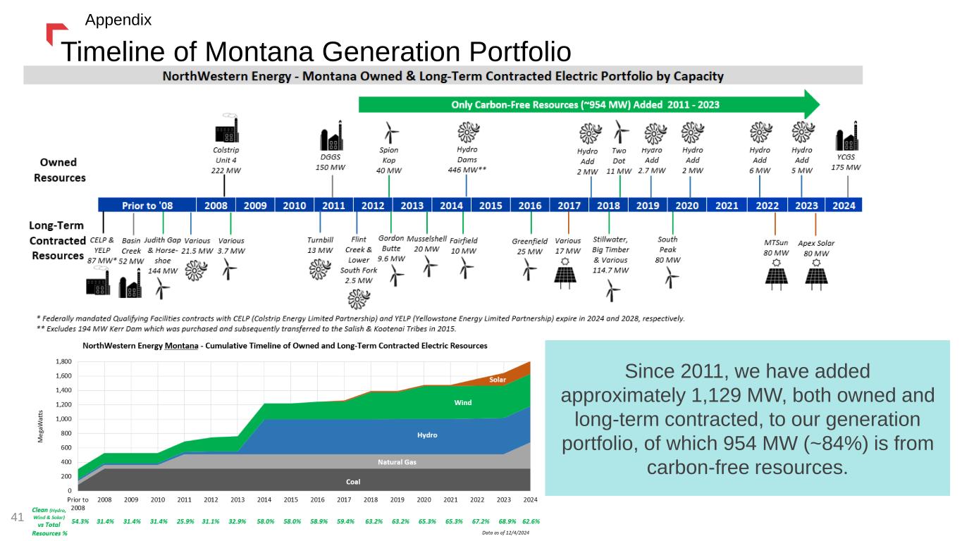 Timeline of Montana Generation Portfolio Since 2011, we have added approximately 1,129 MW, both owned and long-term contracted, to our generation portfolio, of which 954 MW (~84%) is from carbon-free resources. Appendix 41
