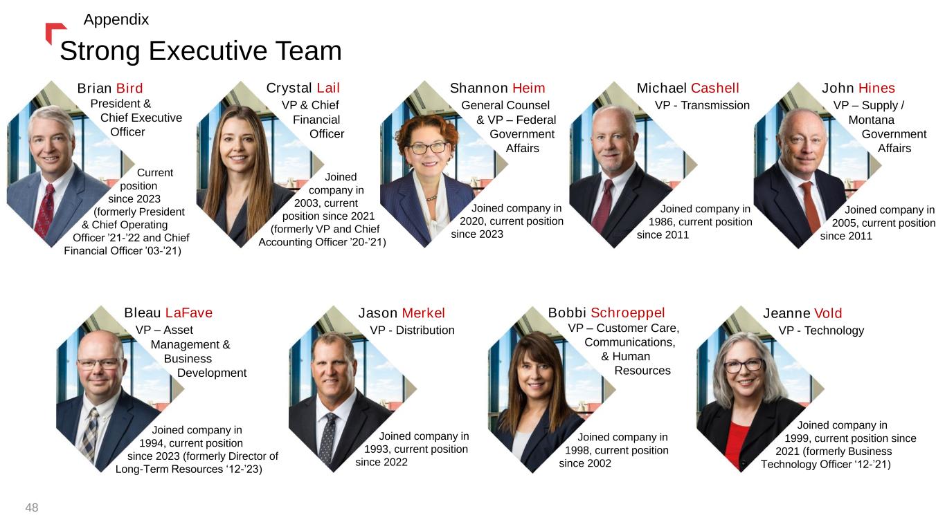 Strong Executive Team 48 Crystal Lail VP & Chief Financial Officer Michael Cashell VP - Transmission Shannon Heim General Counsel & VP – Federal Government Affairs Brian Bird President & Chief Executive Officer Bleau LaFave VP – Asset Management & Business Development Jason Merkel VP - Distribution Bobbi Schroeppel VP – Customer Care, Communications, & Human Resources Jeanne Vold VP - Technology Joined company in 2020, current position since 2023 Joined company in 2003, current position since 2021 (formerly VP and Chief Accounting Officer ’20-’21) Joined company in 1986, current position since 2011 Current position since 2023 (formerly President & Chief Operating Officer ’21-’22 and Chief Financial Officer ’03-’21) Joined company in 1993, current position since 2022 John Hines VP – Supply / Montana Government Affairs Joined company in 2005, current position since 2011 Joined company in 1994, current position since 2023 (formerly Director of Long-Term Resources ‘12-’23) Joined company in 1998, current position since 2002 Joined company in 1999, current position since 2021 (formerly Business Technology Officer ‘12-’21) Appendix