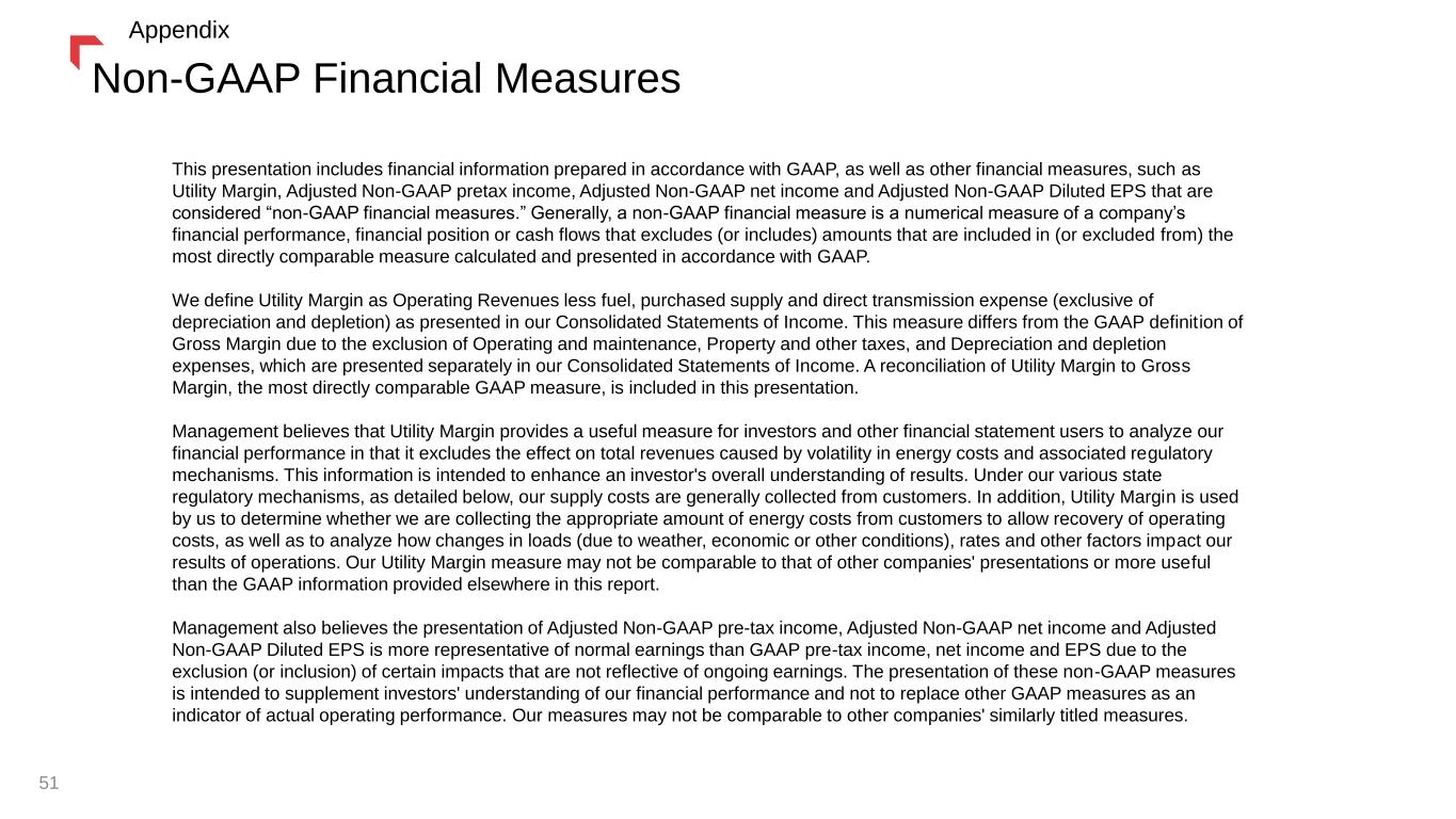 Non-GAAP Financial Measures This presentation includes financial information prepared in accordance with GAAP, as well as other financial measures, such as Utility Margin, Adjusted Non-GAAP pretax income, Adjusted Non-GAAP net income and Adjusted Non-GAAP Diluted EPS that are considered “non-GAAP financial measures.” Generally, a non-GAAP financial measure is a numerical measure of a company’s financial performance, financial position or cash flows that excludes (or includes) amounts that are included in (or excluded from) the most directly comparable measure calculated and presented in accordance with GAAP. We define Utility Margin as Operating Revenues less fuel, purchased supply and direct transmission expense (exclusive of depreciation and depletion) as presented in our Consolidated Statements of Income. This measure differs from the GAAP definition of Gross Margin due to the exclusion of Operating and maintenance, Property and other taxes, and Depreciation and depletion expenses, which are presented separately in our Consolidated Statements of Income. A reconciliation of Utility Margin to Gross Margin, the most directly comparable GAAP measure, is included in this presentation. Management believes that Utility Margin provides a useful measure for investors and other financial statement users to analyze our financial performance in that it excludes the effect on total revenues caused by volatility in energy costs and associated regulatory mechanisms. This information is intended to enhance an investor's overall understanding of results. Under our various state regulatory mechanisms, as detailed below, our supply costs are generally collected from customers. In addition, Utility Margin is used by us to determine whether we are collecting the appropriate amount of energy costs from customers to allow recovery of operating costs, as well as to analyze how changes in loads (due to weather, economic or other conditions), rates and other factors impact our results of operations. Our Utility Margin measure may not be comparable to that of other companies' presentations or more useful than the GAAP information provided elsewhere in this report. Management also believes the presentation of Adjusted Non-GAAP pre-tax income, Adjusted Non-GAAP net income and Adjusted Non-GAAP Diluted EPS is more representative of normal earnings than GAAP pre-tax income, net income and EPS due to the exclusion (or inclusion) of certain impacts that are not reflective of ongoing earnings. The presentation of these non-GAAP measures is intended to supplement investors' understanding of our financial performance and not to replace other GAAP measures as an indicator of actual operating performance. Our measures may not be comparable to other companies' similarly titled measures. 51 Appendix