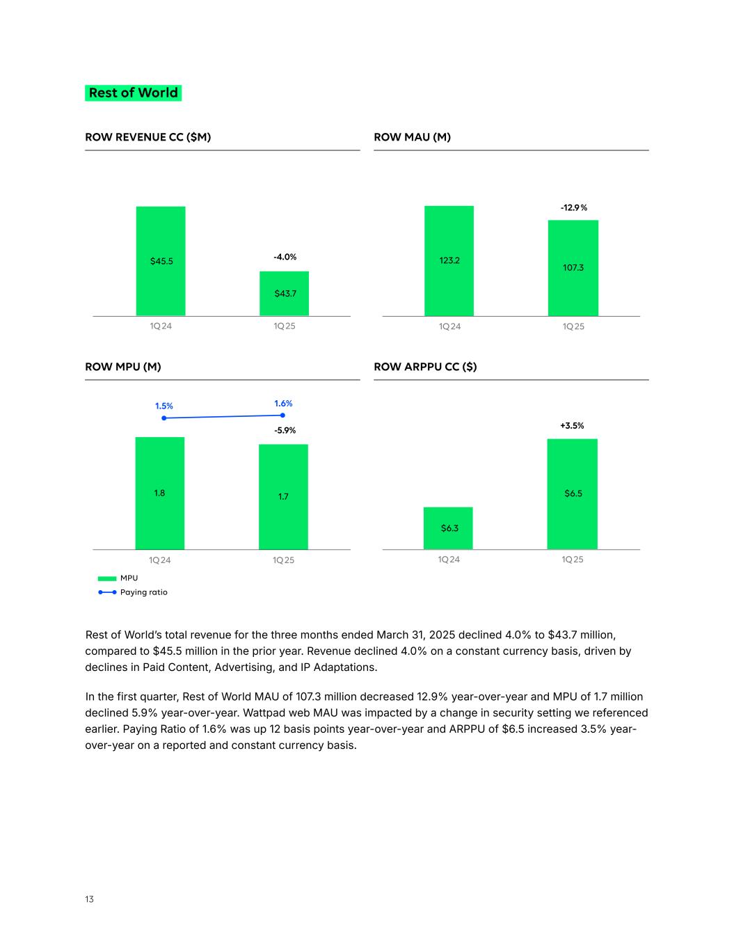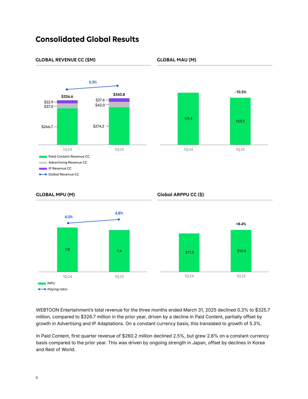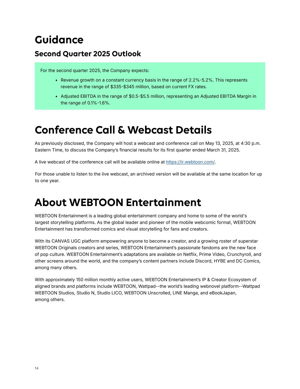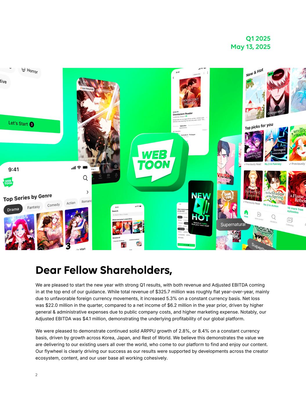 ロサンゼルス 2025年5月13日 (GLOBE NEWSWIRE) -- WEBTOON Entertainment Inc. (Nasdaq: WBTN) (以下、「WEBTOON Entertainment」または「当社」) は本日、世界最大級のストーリーテリング・プラットフォームを擁する世界有数のエンターテインメント企業として、2025年3月31日締めの第1四半期の業績を発表しました。これらの業績に関する詳細は、当社ウェブサイトの投資家向け情報セクションの株主通信に掲載されています。