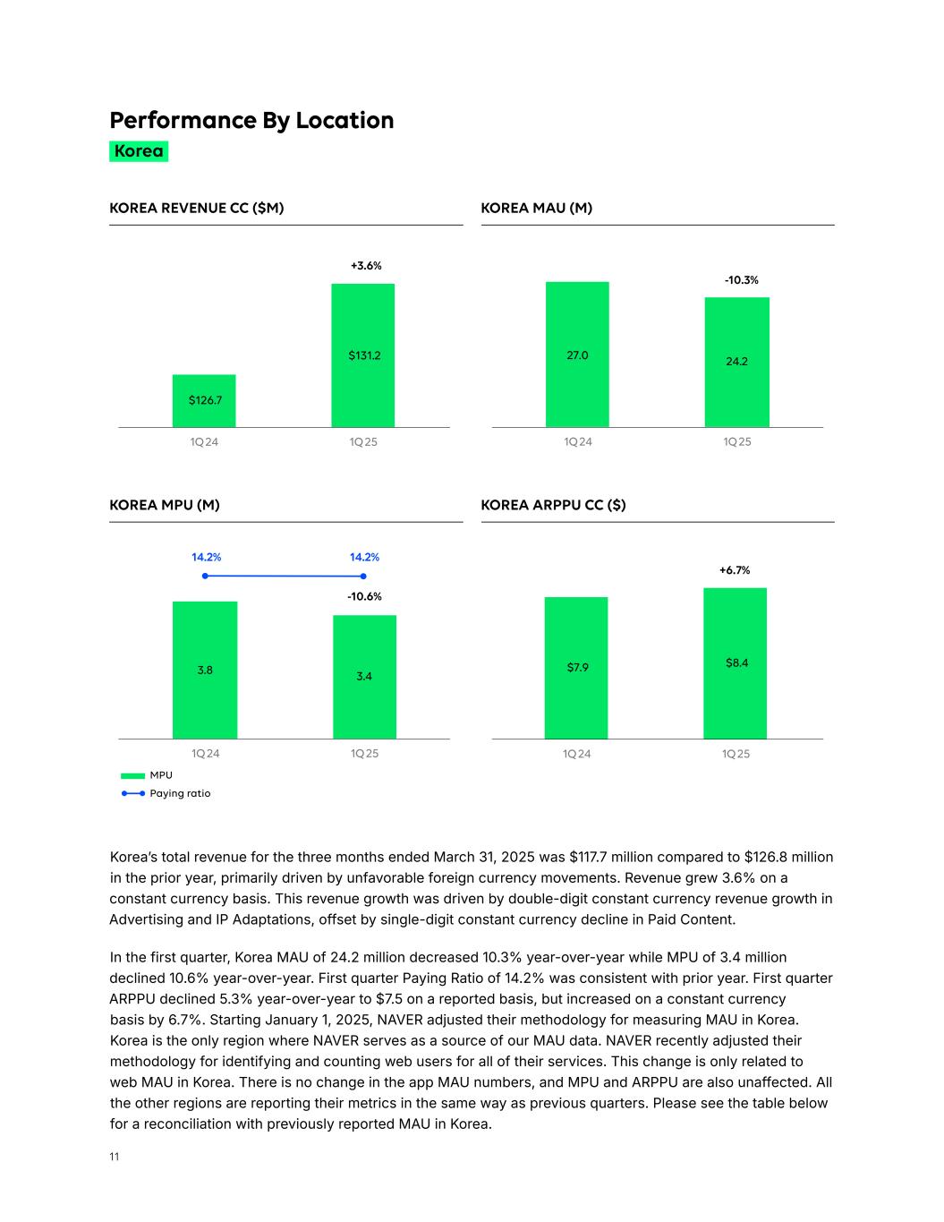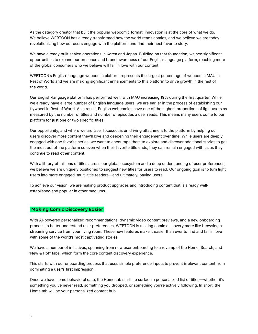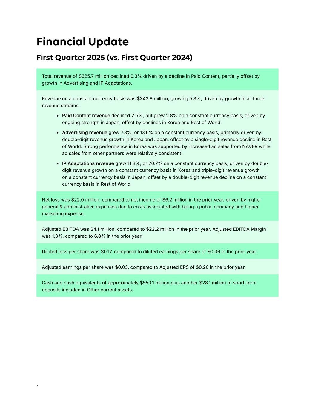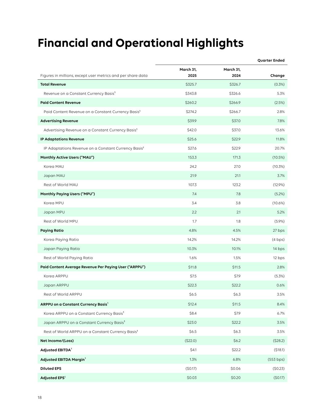 創業者兼CEOのジュンク・キムは、「売上高と調整後EBITDAがともにガイダンスの中間値を上回ったことを嬉しく思います。総収益は恒常為替レートベースで5.3%増となり、有料コンテンツ、広告、IPアダプテーションの3つの収益ストリームすべてが成長に貢献しました。"
