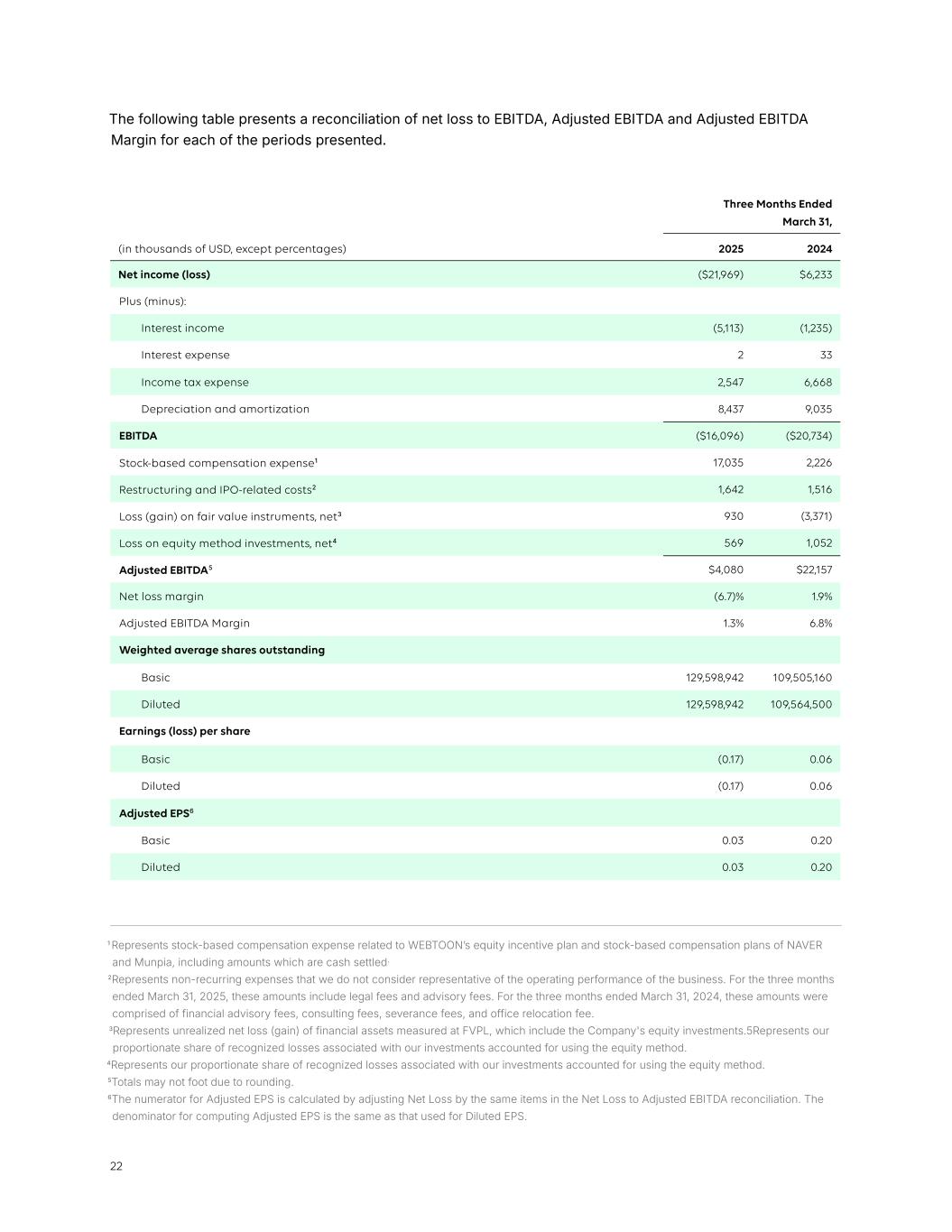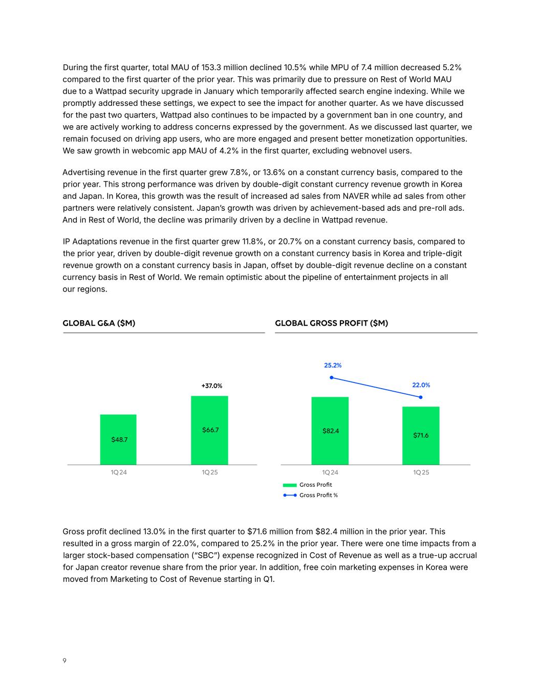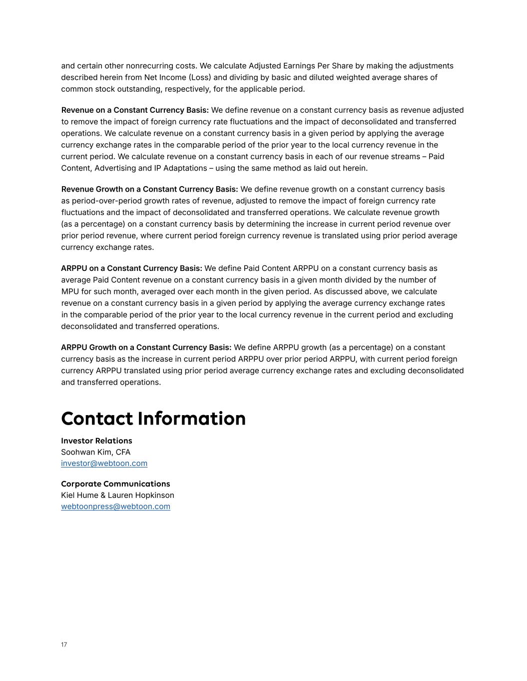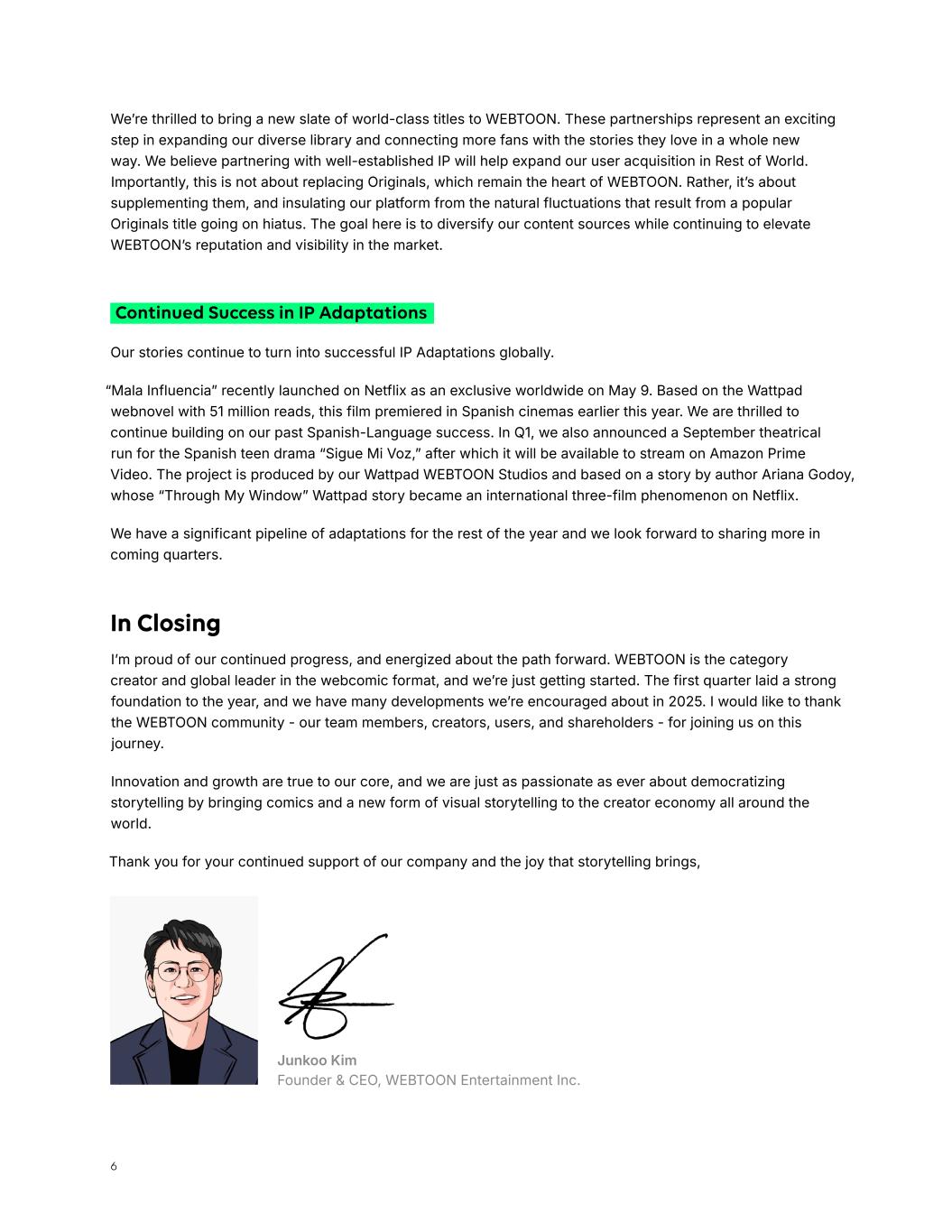 創業者兼CEOのジュンク・キムは、「売上高と調整後EBITDAがともにガイダンスの中間値を上回ったことを嬉しく思います。総収益は恒常為替レートベースで5.3%増となり、有料コンテンツ、広告、IPアダプテーションの3つの収益ストリームすべてが成長に貢献しました。"