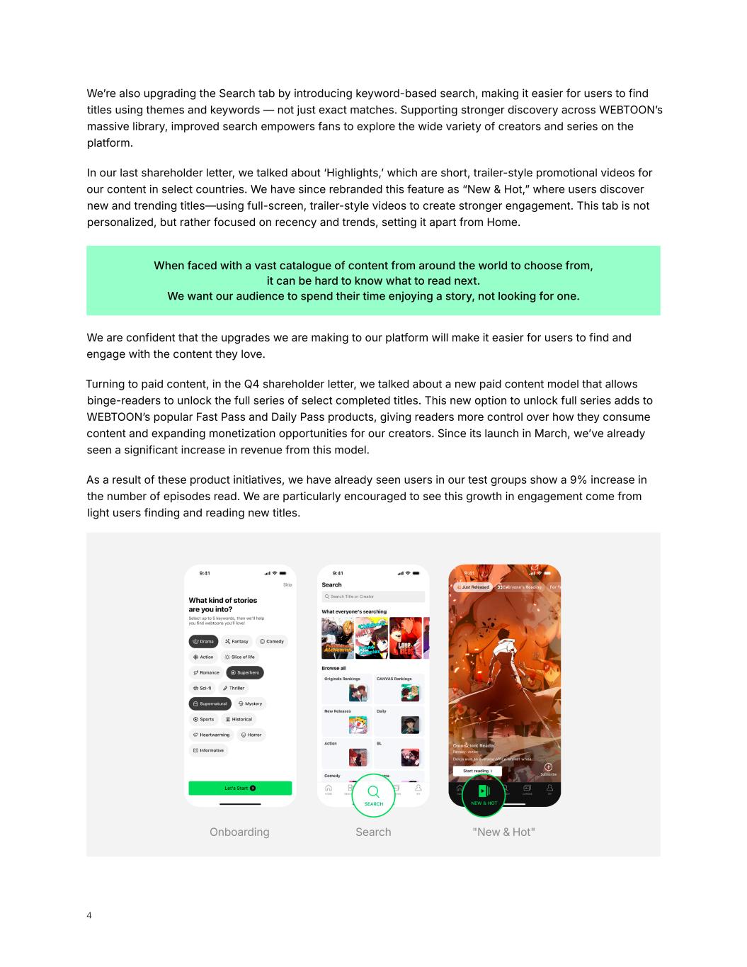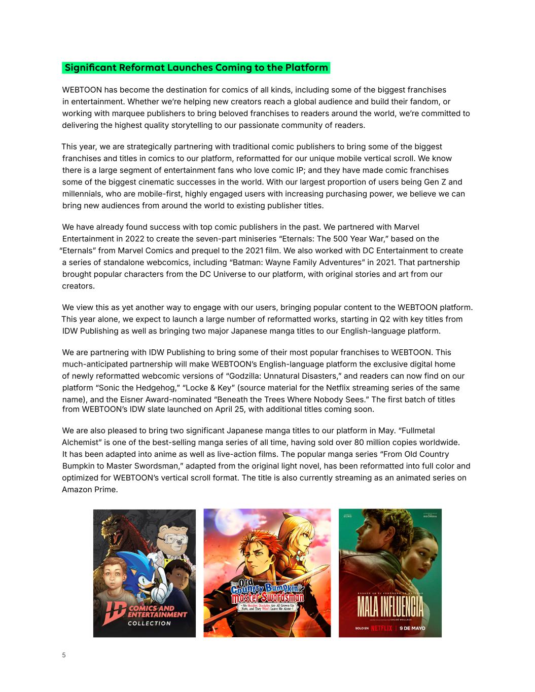 第1四半期には、AIを活用したディスカバリー機能の改善など、英語版プラットフォームの重要な機能強化に着手し、ユーザーはストーリーを探す時間を減らし、より多くの時間をストーリーを楽しむことができるようになりました。また、「ゴジラ」や「ソニック・ザ・ヘッジホッグ」のような世界的なメジャー・フランチャイズを当社のプラットフォームに導入できたことにも興奮しています。今後も多様なコンテンツ・ライブラリーを拡大し、より多くのファンと彼らが愛する物語を全く新しい方法で繋いでいくことを楽しみにしています。"