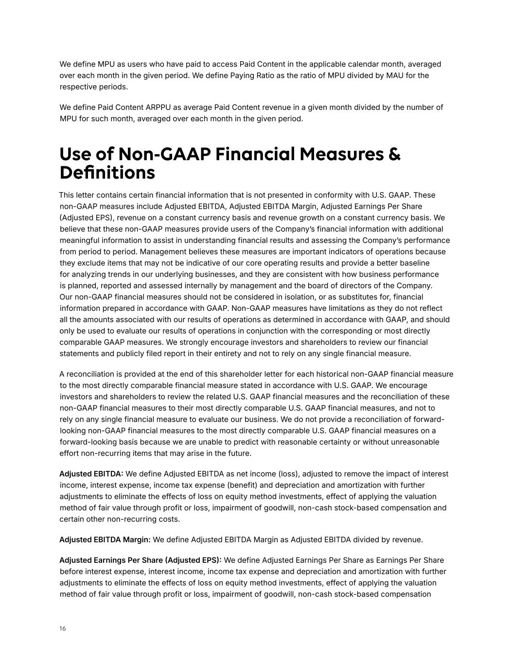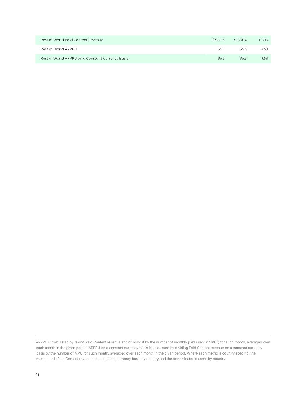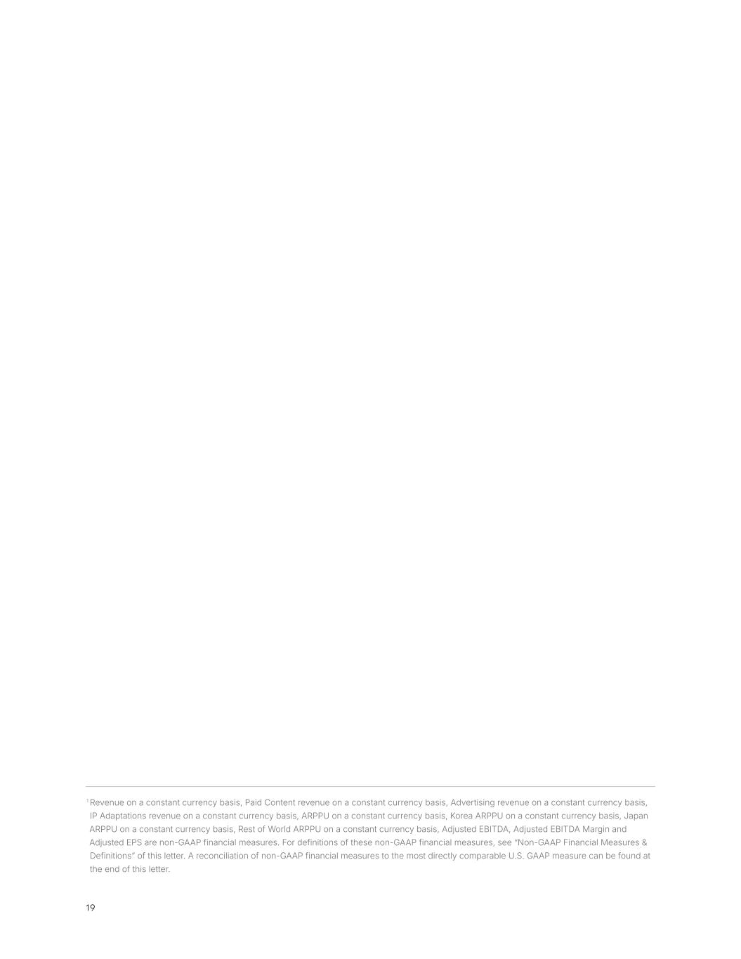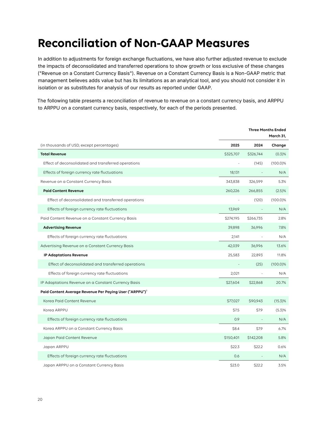 恒常通貨ベースの収益:恒常通貨ベース売上高:恒常通貨ベース売上高とは、為替レート変動の影響および非連結・移管事業の影響を除去するために調整された売上高と定義する。恒常為替レートによる収益は、当期の現地通貨建て収益に前年同期の平均為替レートを適用することにより計算される。当社は、有料コンテンツ、広告、IPアダプテーションの各収益ストリームにおいて、ここに記載されているのと同じ方法で恒常為替レートベースの収益を計算しています。