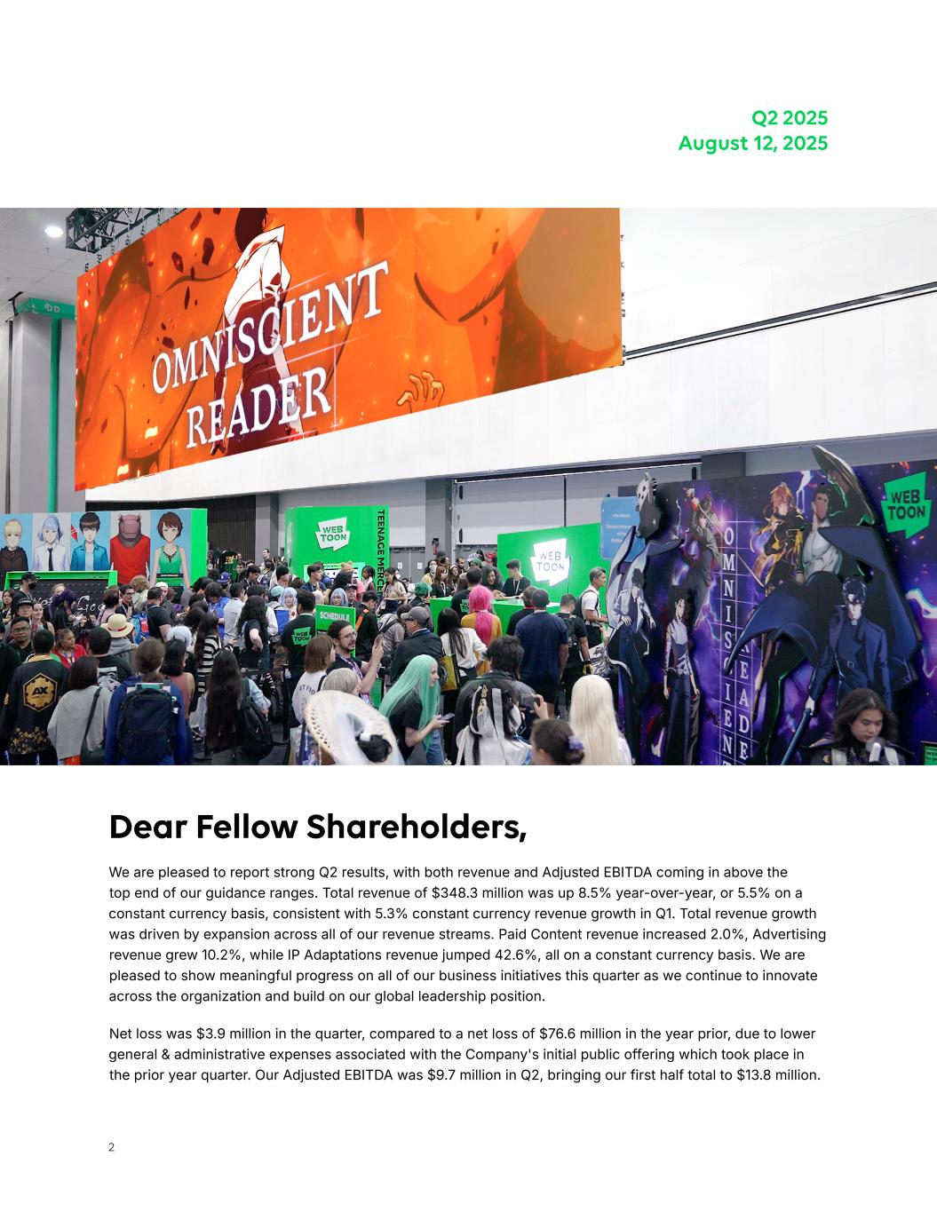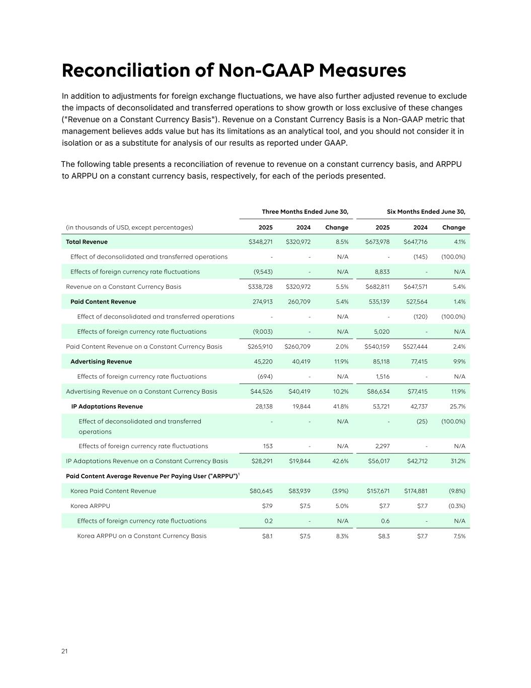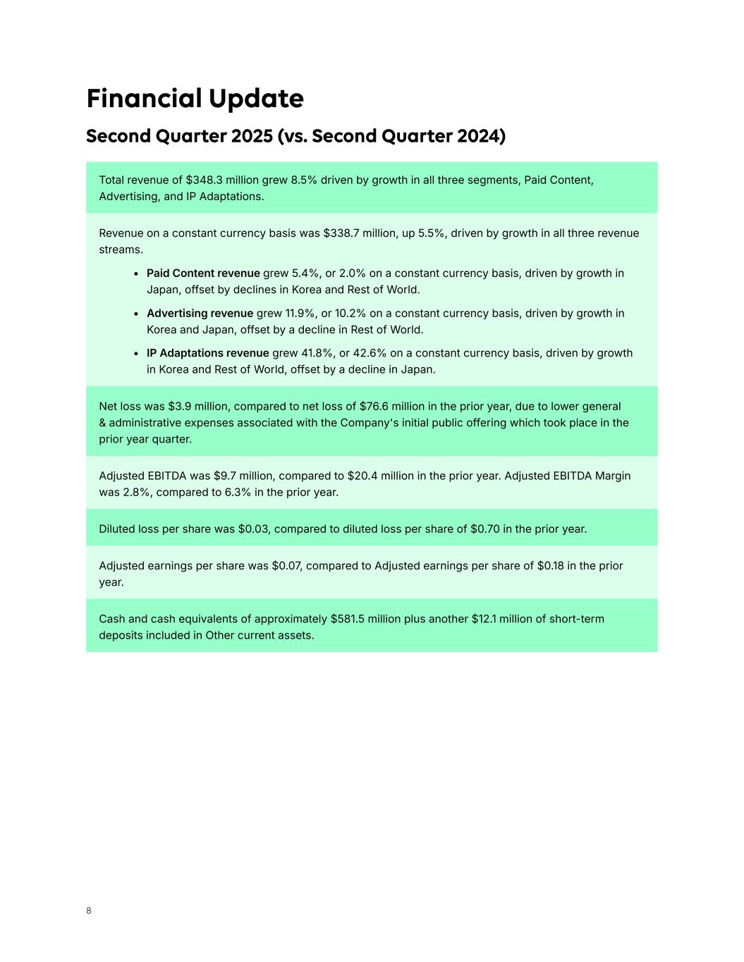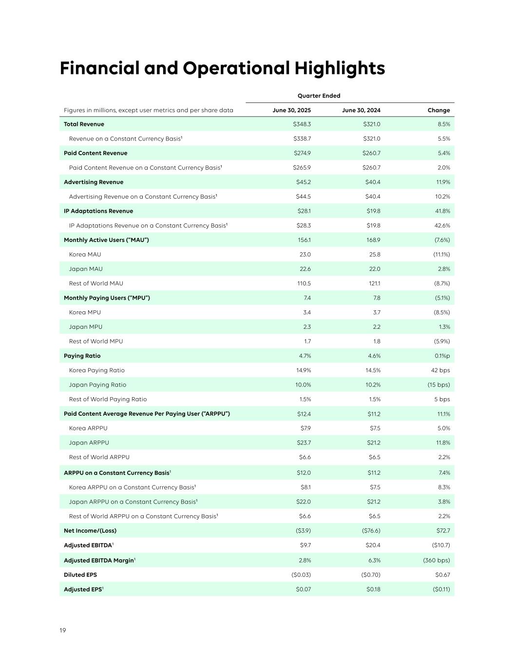 Junkoo Kim, Founder and CEO, said, “We are pleased to report strong second quarter results, with both revenue and Adjusted EBITDA coming in above the top end of our guidance range. Total revenue was up 5.5% on a constant currency basis, with growth in all three revenue streams – Paid Content, Advertising, and IP Adaptations – as we continue to build our leadership position globally.”