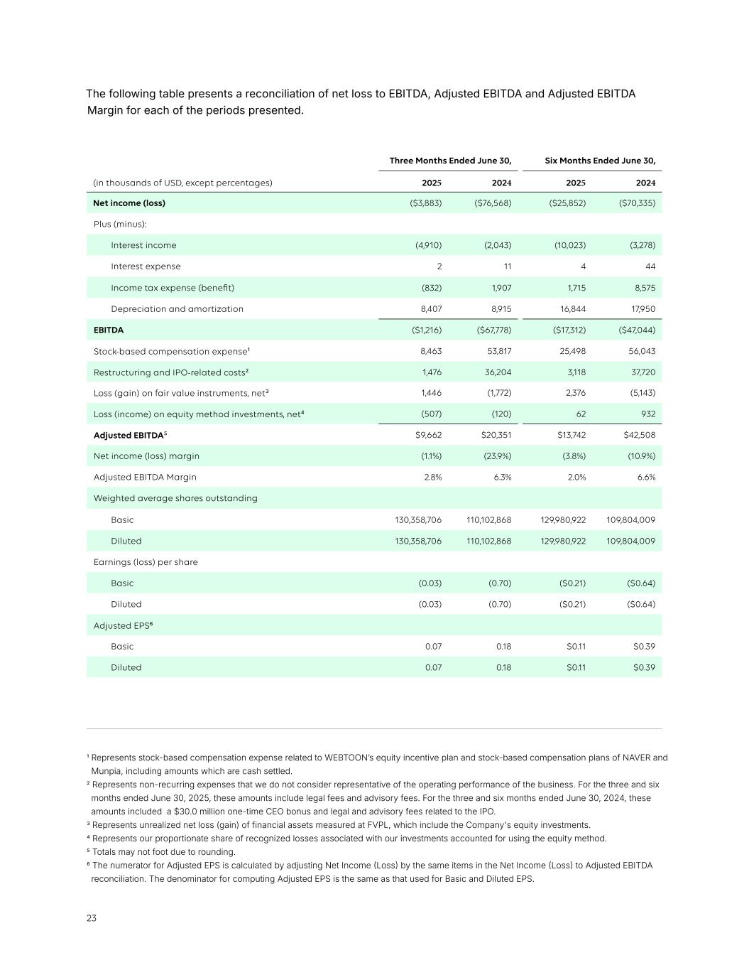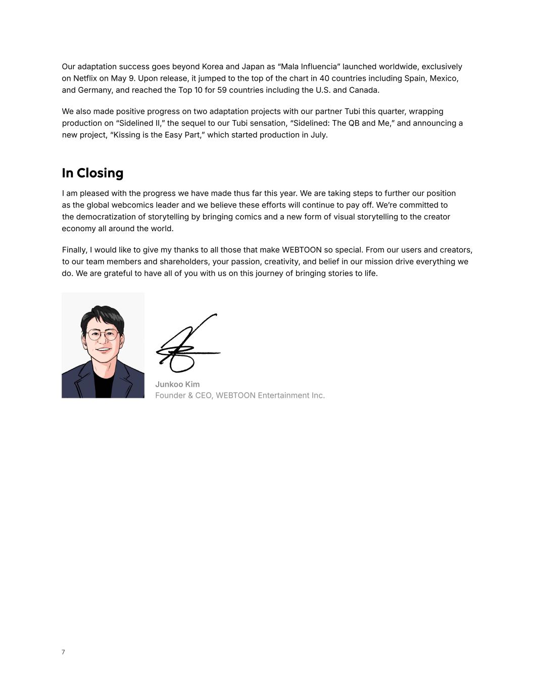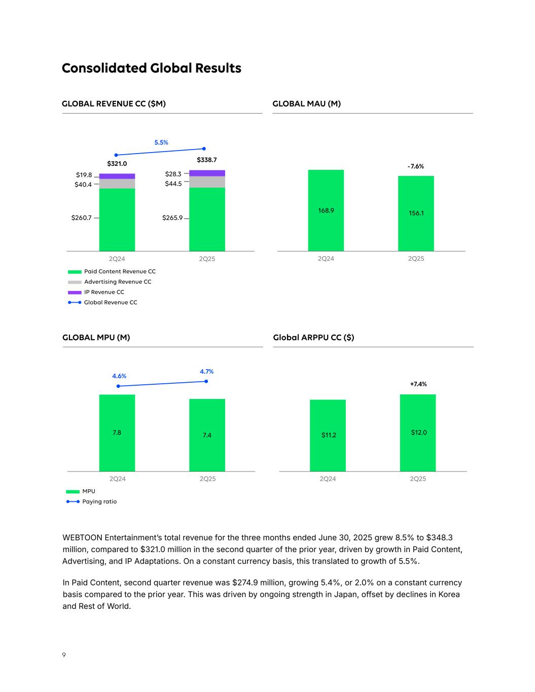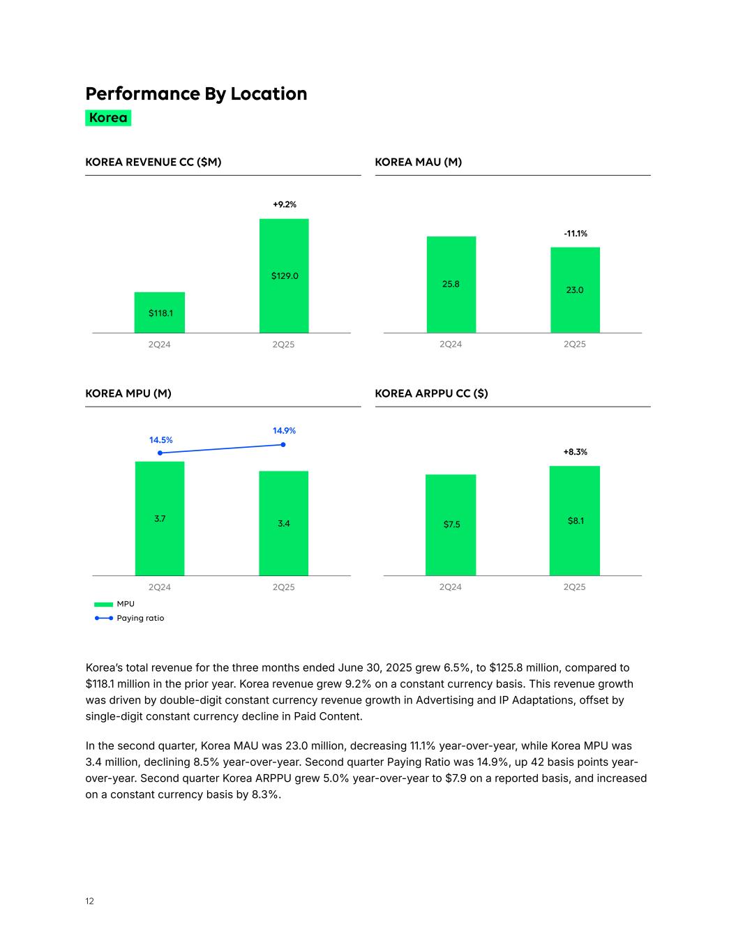Junkoo Kim, Founder and CEO, said, “We are pleased to report strong second quarter results, with both revenue and Adjusted EBITDA coming in above the top end of our guidance range. Total revenue was up 5.5% on a constant currency basis, with growth in all three revenue streams – Paid Content, Advertising, and IP Adaptations – as we continue to build our leadership position globally.”
