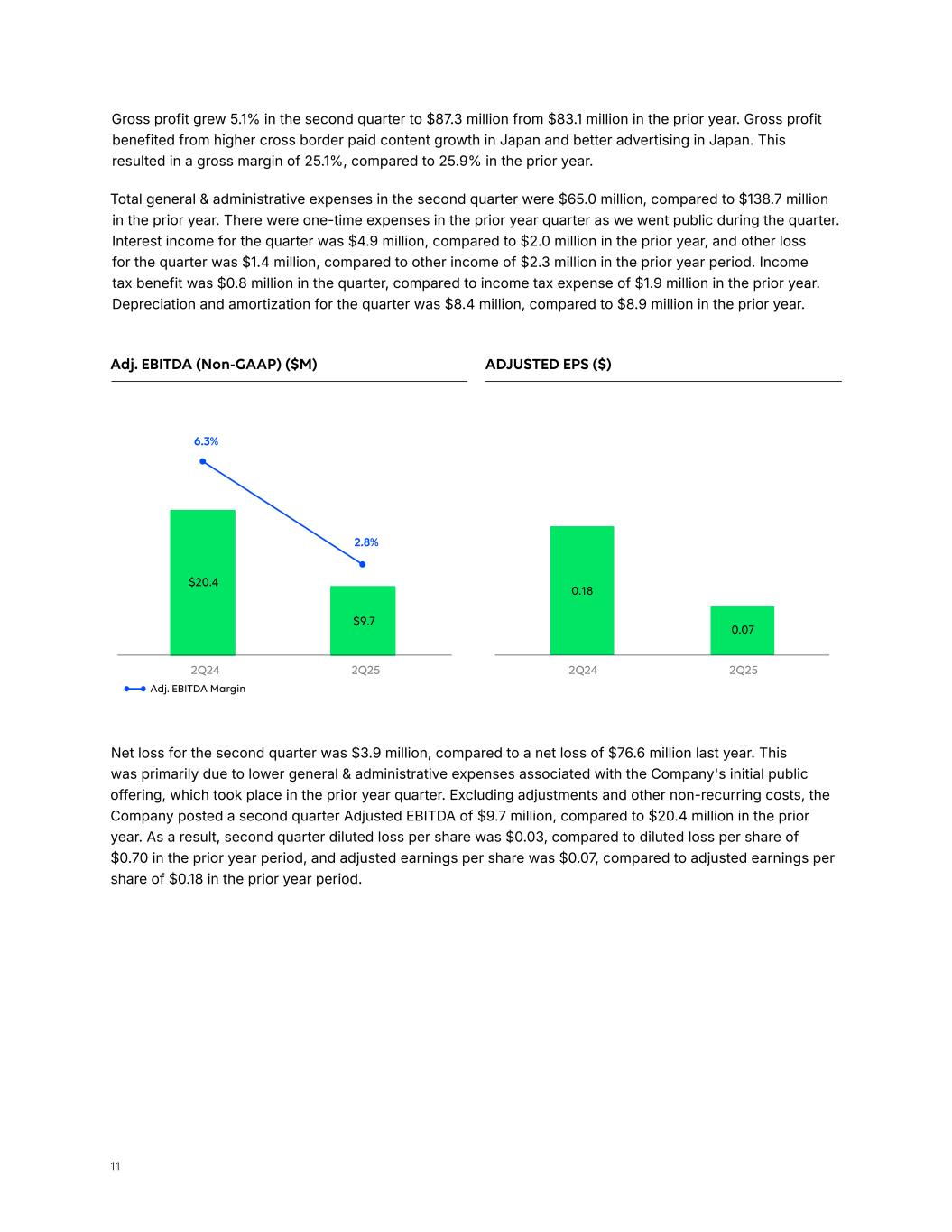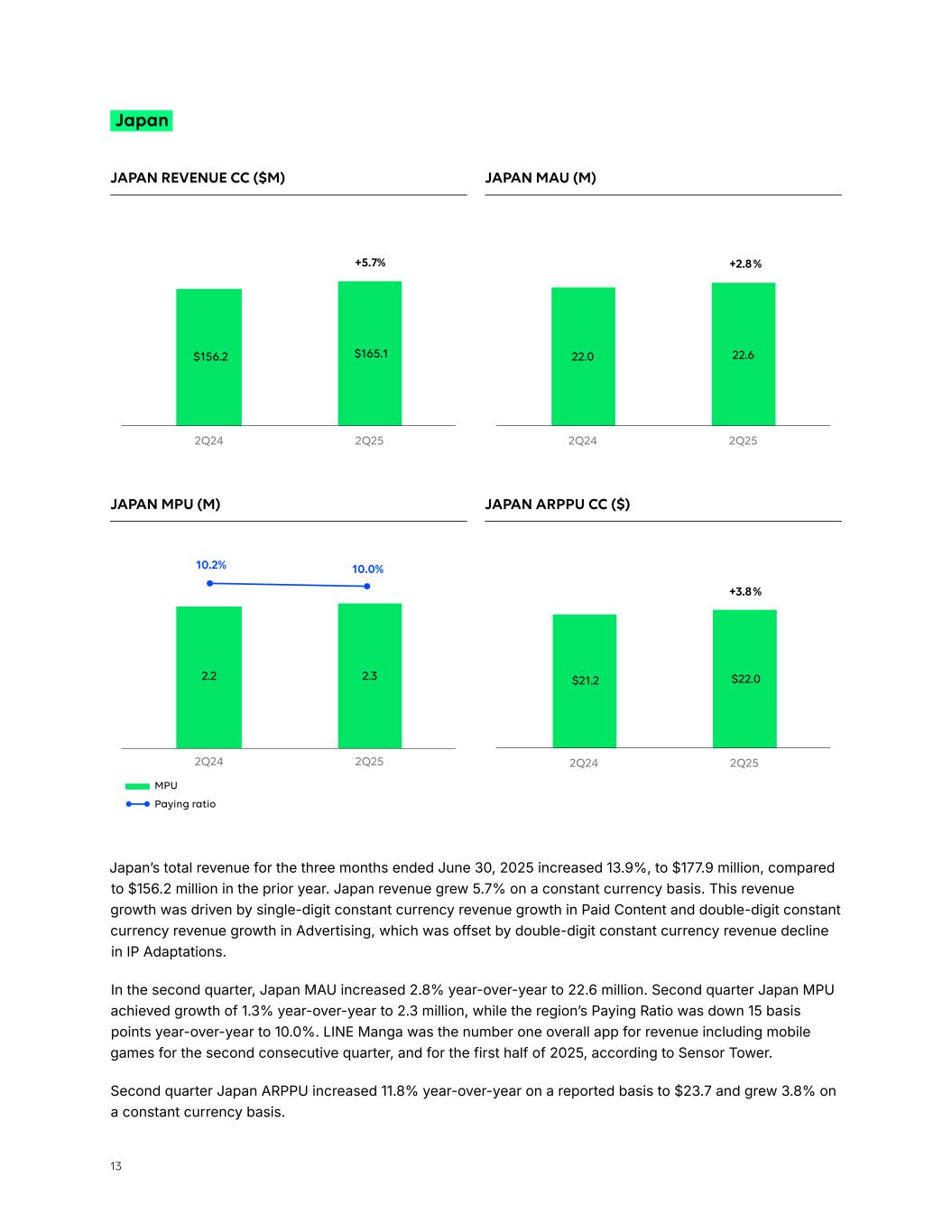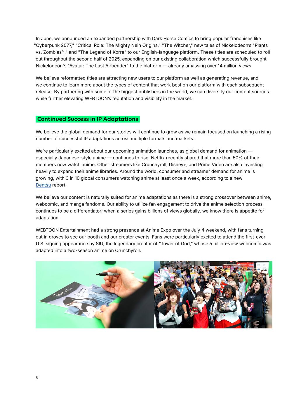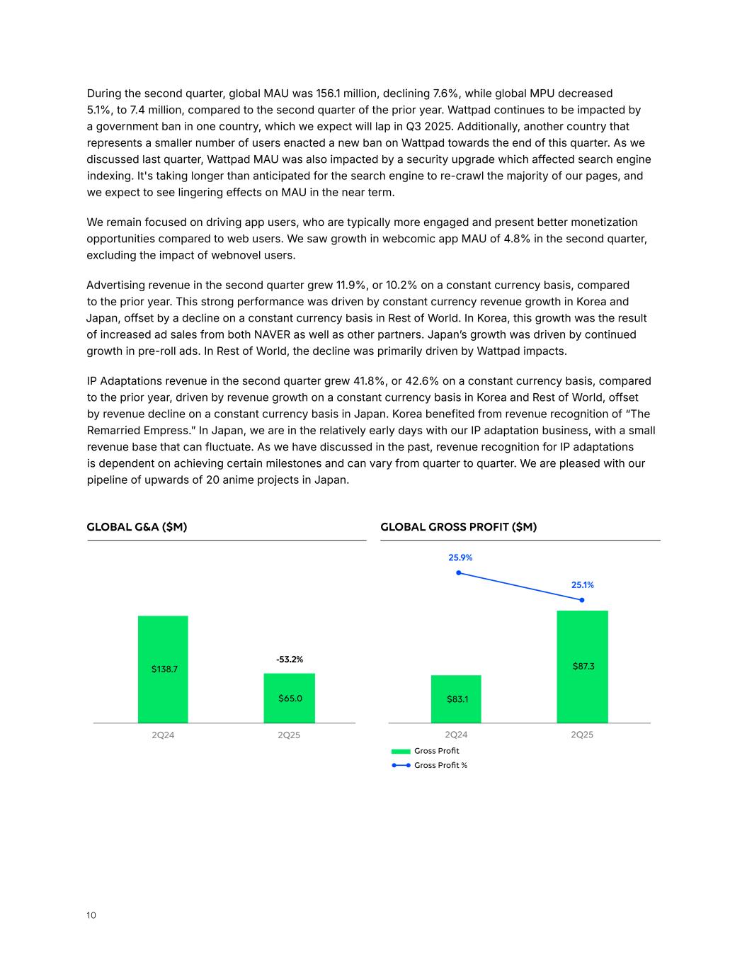 Junkoo Kim, Founder and CEO, said, “We are pleased to report strong second quarter results, with both revenue and Adjusted EBITDA coming in above the top end of our guidance range. Total revenue was up 5.5% on a constant currency basis, with growth in all three revenue streams – Paid Content, Advertising, and IP Adaptations – as we continue to build our leadership position globally.”
