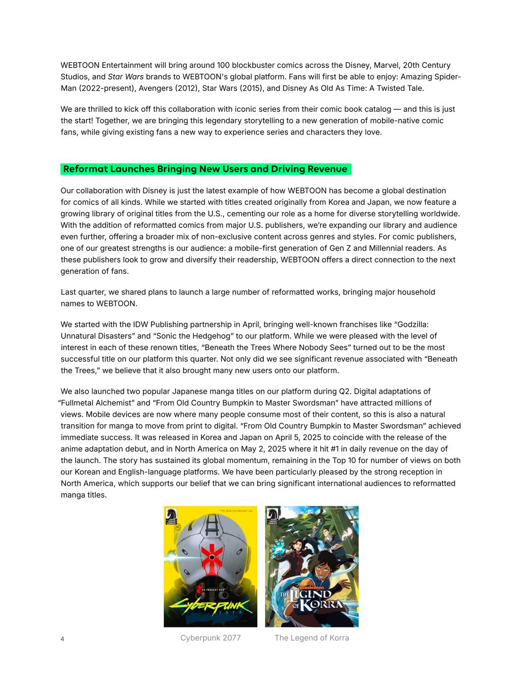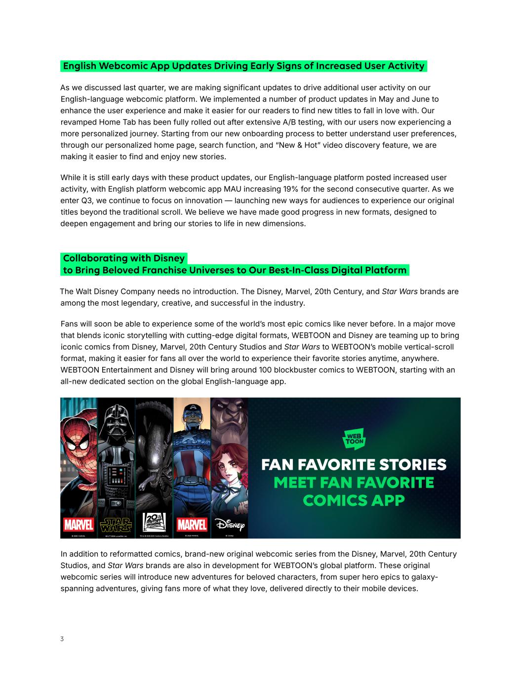 The Company also announced in a separate press release today that it is teaming up with Disney to bring iconic comics from Marvel, Star Wars, Disney Studios, and 20th Century Studios to WEBTOON Entertainment's mobile vertical-scroll format.