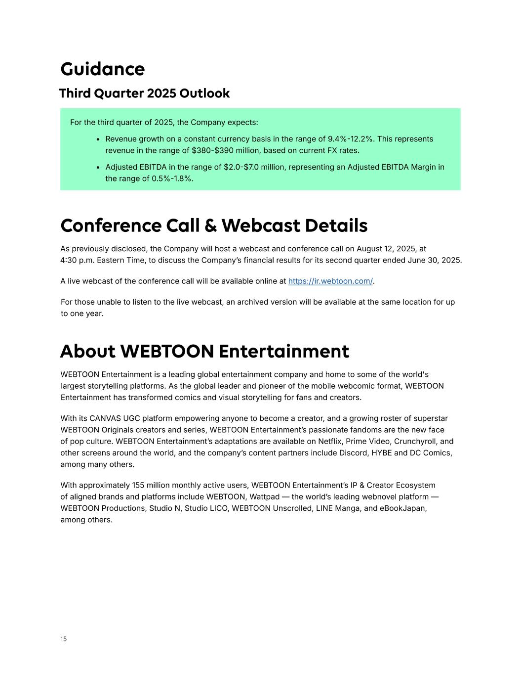 LOS ANGELES, August 12, 2025 (GLOBE NEWSWIRE) -- WEBTOON Entertainment Inc. (Nasdaq: WBTN) (“WEBTOON Entertainment” or “the Company”), a leading global entertainment company and home to some of the world’s largest storytelling platforms, today announced results for its second quarter ended June 30, 2025. More information about these results can be found in the Company’s shareholder letter on the investor relations section of its website.