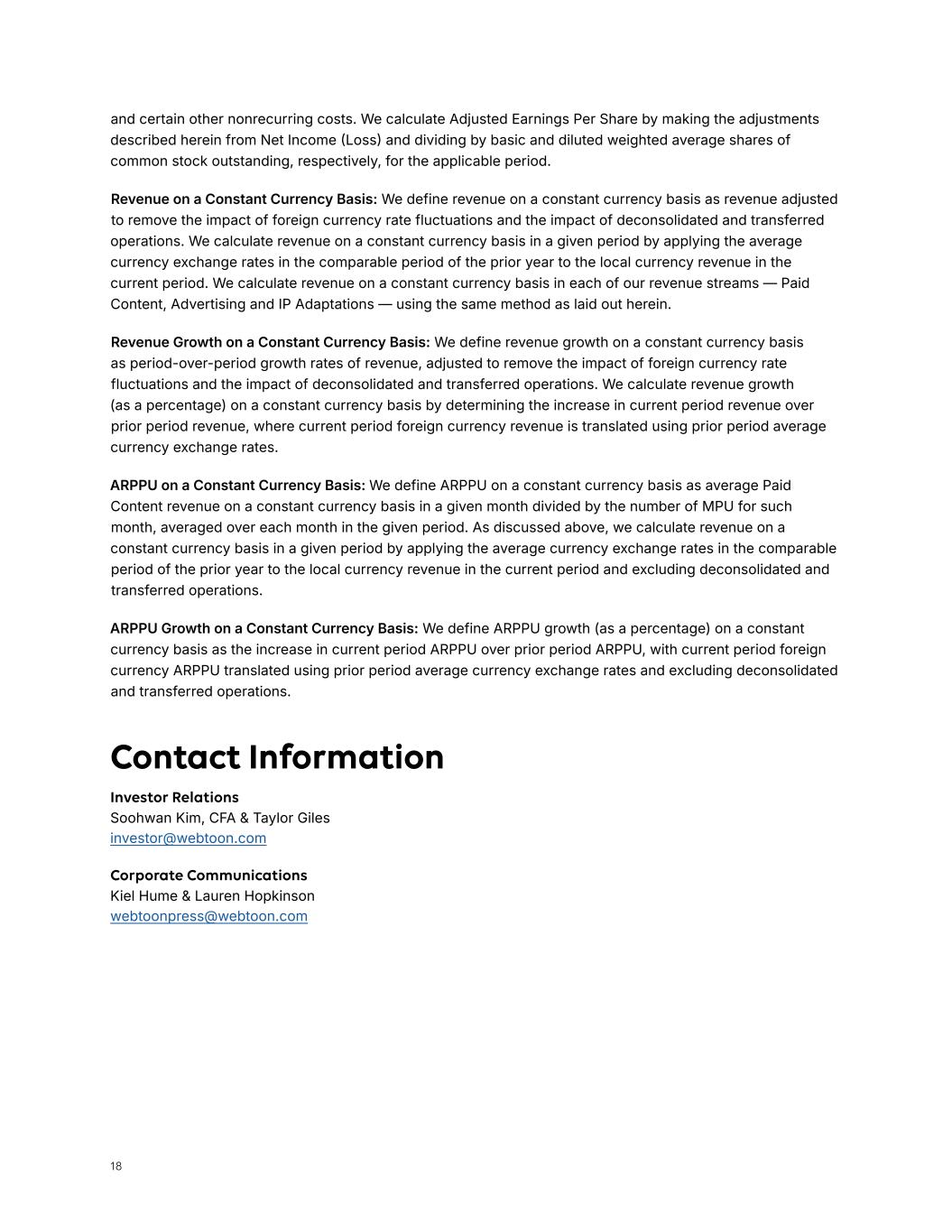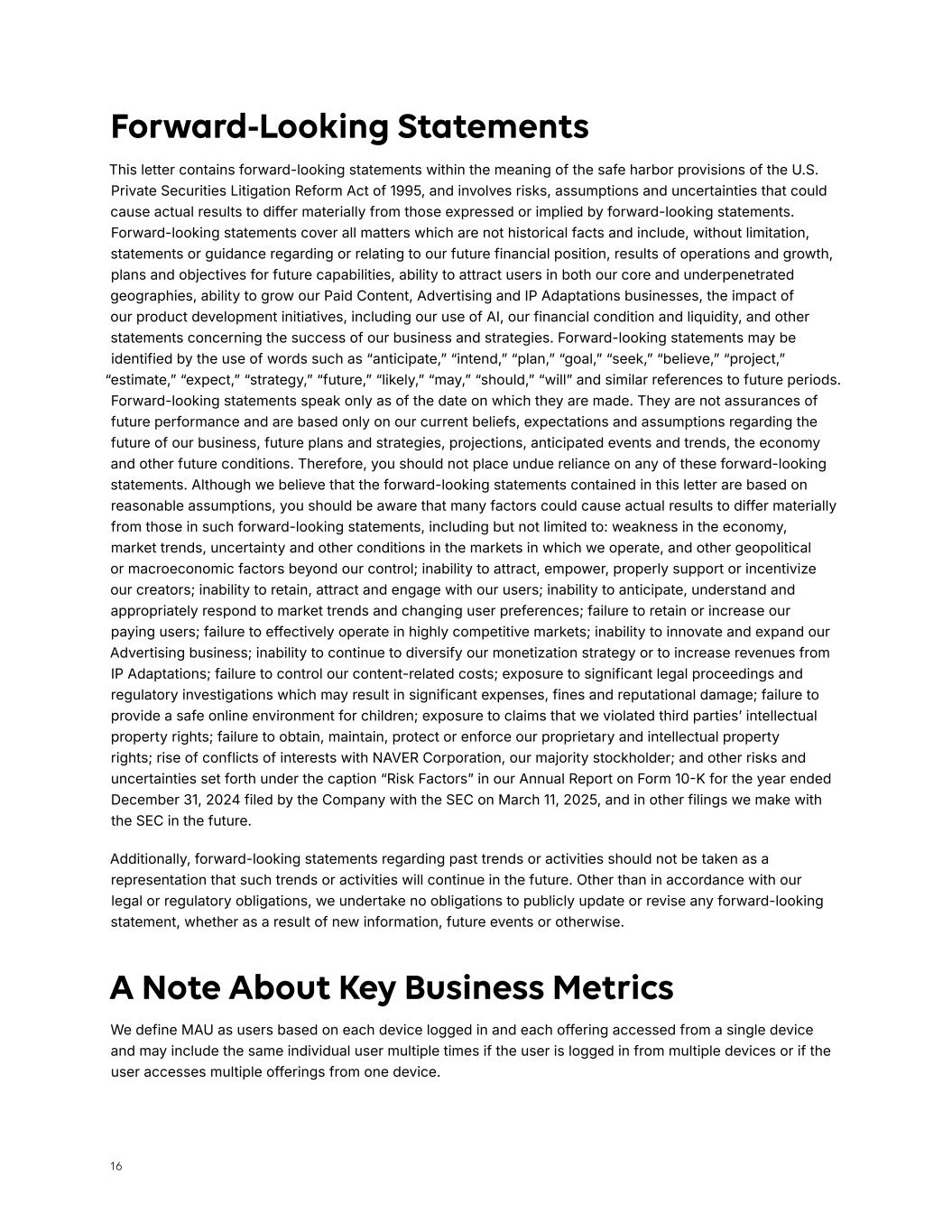Although we believe that the forward-looking statements contained in this release are based on reasonable assumptions, you should be aware that many factors could cause actual results to differ materially from those in such forward-looking statements, including, but not limited to: weakness in the economy, market trends, uncertainty and other conditions in the markets in which we operate, and other geopolitical or macroeconomic factors beyond our control; inability to attract, empower, properly support or incentivize our creators; inability to retain, attract and engage with our users; inability to anticipate, understand and appropriately respond to market trends and changing user preferences; failure to retain or increase our paying users; failure to effectively operate in highly competitive markets; inability to innovate and expand our Advertising business; inability to continue to diversify our monetization strategy or to increase revenues from IP Adaptations; failure to control our content-related costs; exposure to significant legal proceedings and regulatory investigations which may result in significant expenses, fines and reputational damage; failure to provide a safe online environment for children; exposure to claims that we violated third parties’ intellectual property rights; failure to obtain, maintain, protect or enforce our proprietary and intellectual property rights; rise of conflicts of interests with NAVER Corporation, our majority stockholder; and other risks and uncertainties set forth under the caption “Risk Factors” in our Annual Report on Form 10-K for the year ended December 31, 2024 filed by the Company with the SEC on March 11, 2025, and in other filings we make with the SEC in the future.