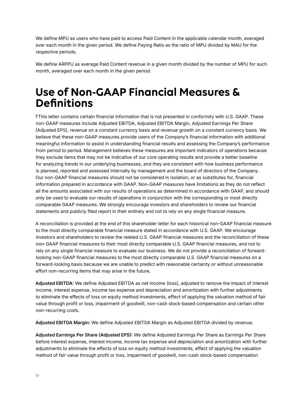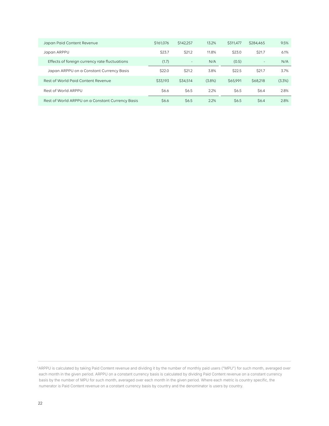 1ARPPU is calculated by taking Paid Content revenue and dividing it by the number of monthly paid users ("MPU") for such month, averaged over each month in the given period. ARPPU on a constant currency basis is calculated by dividing Paid Content revenue on a constant currency basis by the number of MPU for such month, averaged over each month in the given period. Where each metric is country specific, the numerator is Paid Content revenue on a constant currency basis by country and the denominator is users by country.