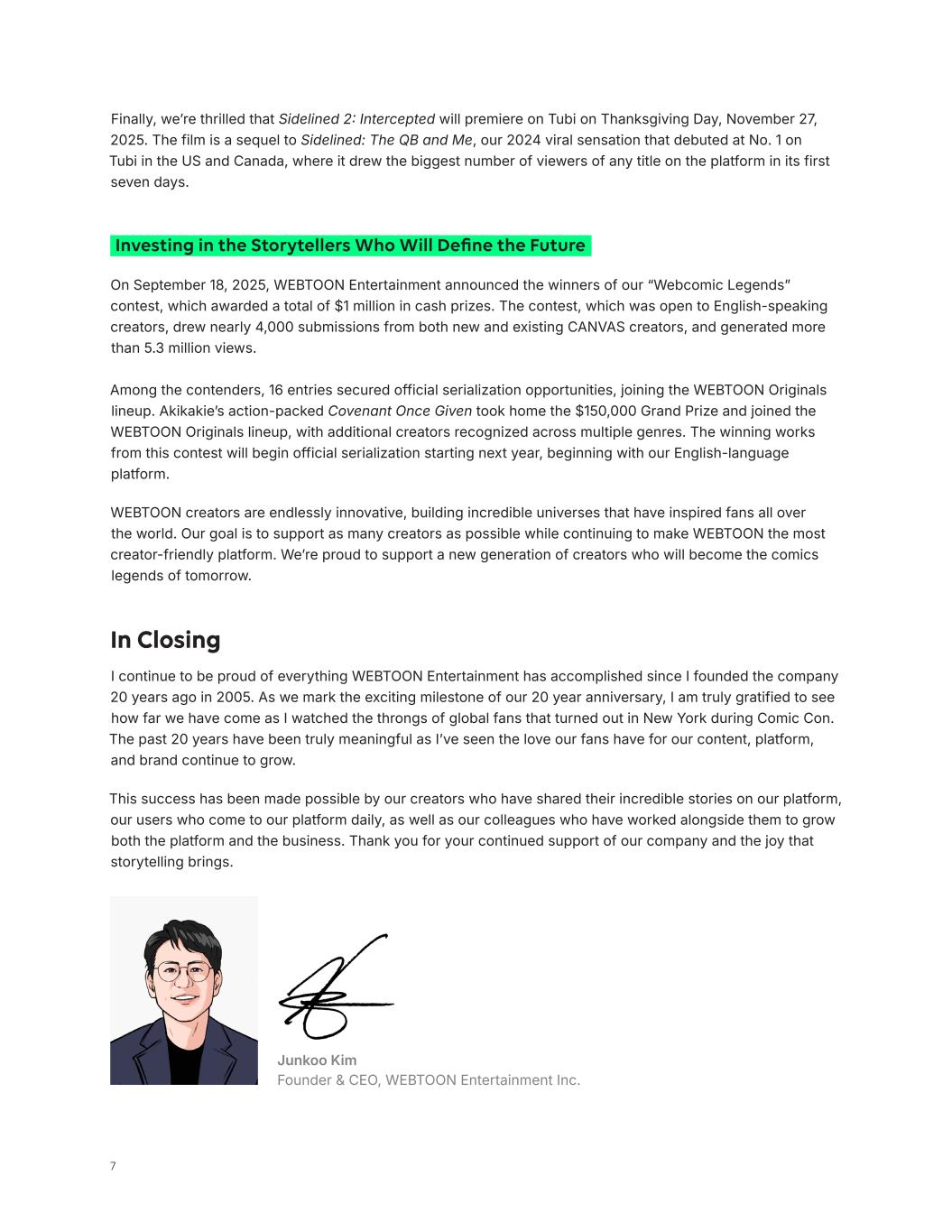 ディズニーとの関係を拡大し、まったく新しいデジタルコミックス・プラットフォームを開発することや、ディズニーがウェブトゥーン・エンターテインメントの株式2%を取得することで拘束力のない合意に達したことなどです。これらのマイルストーンは強力な次のステップを示すものであり、あらゆる種類のコミックの世界的なデスティネーションになることに引き続き注力するための強固な基盤を築くものです。また、当四半期は、新たなストーリー展開のフォーマットや体験を提供することで、プラットフォームのイノベーションを推進するとともに、世界的な評価を得たIPの映画化を成功させました。WEBTOONの20年にわたる成功の実績を基に、私たちの勢いを誇りに思うと同時に、長期的にさらなる成長を遂げることができると確信しています。"