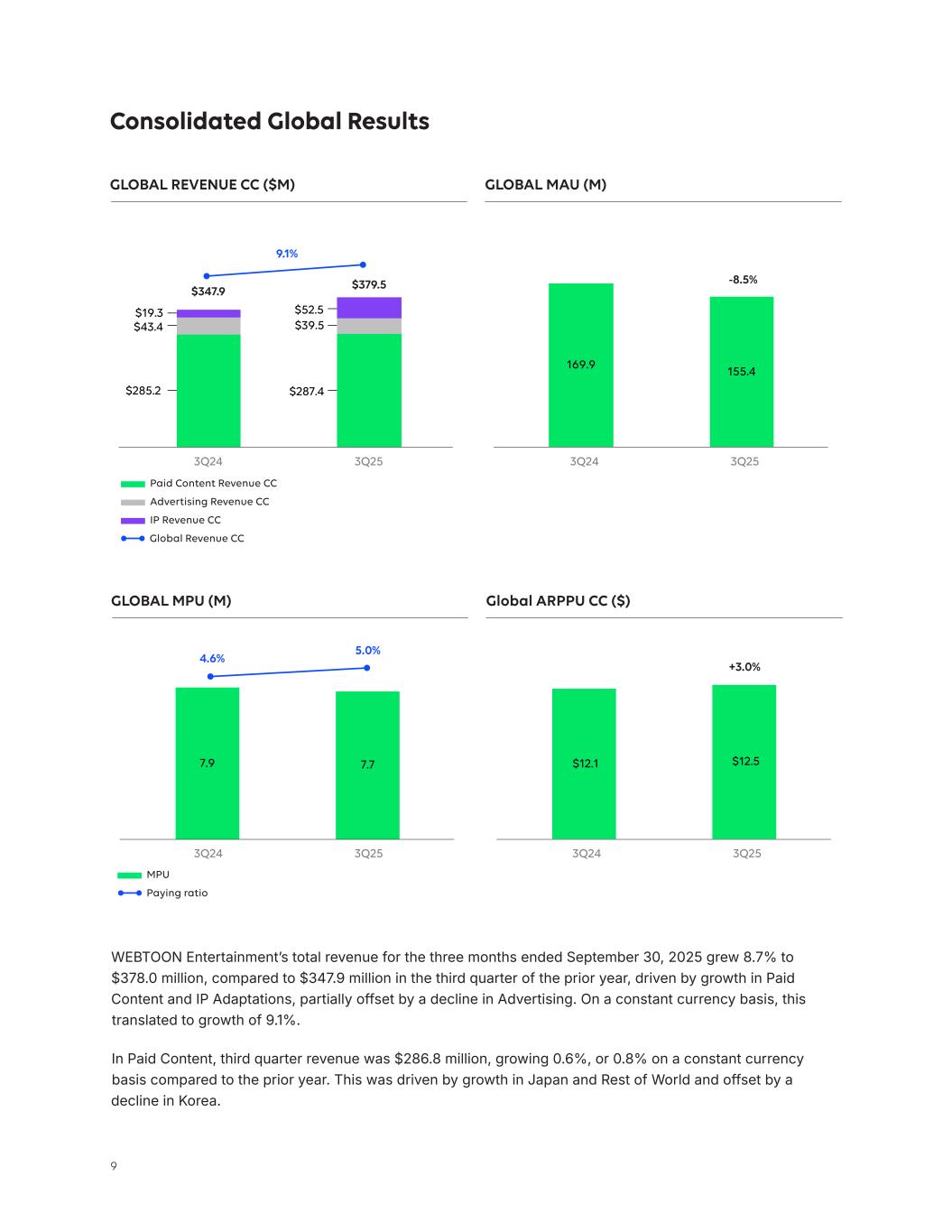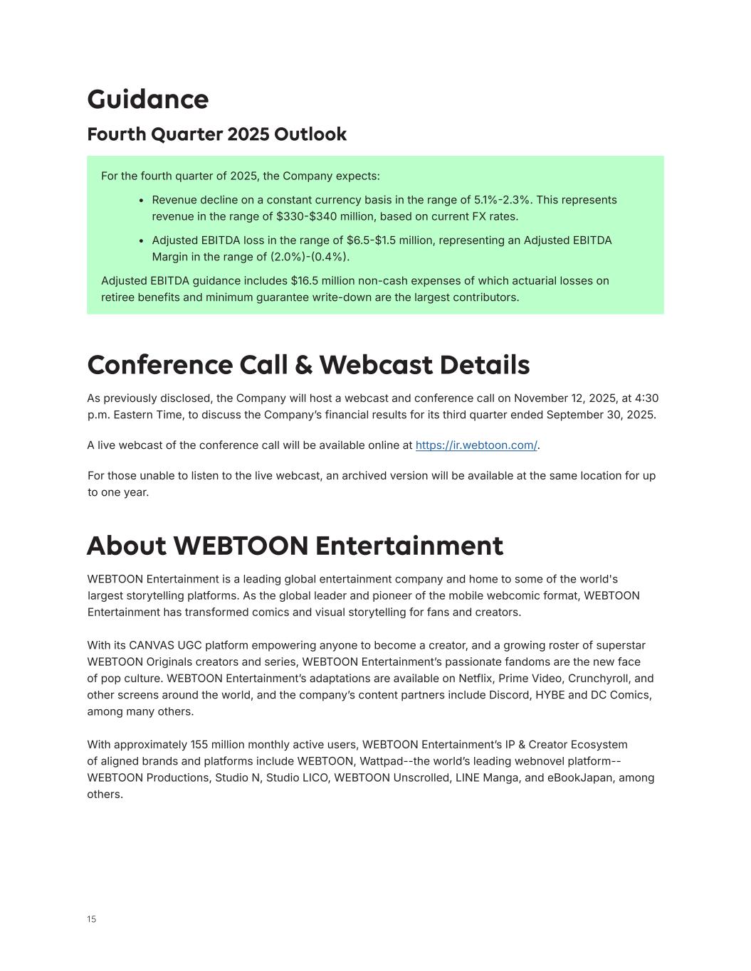ロサンゼルス2025年11月12日 (GLOBE NEWSWIRE) -- WEBTOON Entertainment Inc. (Nasdaq: WBTN) (以下、「WEBTOON Entertainment」または「当社」) は本日、世界最大級のストーリーテリング・プラットフォームを擁する世界有数のエンターテインメント企業として、2025年9月30日を期末とする第3四半期の業績を発表しました。これらの業績に関する詳細は、当社ウェブサイトの投資家向け情報セクションの株主通信に掲載されています。