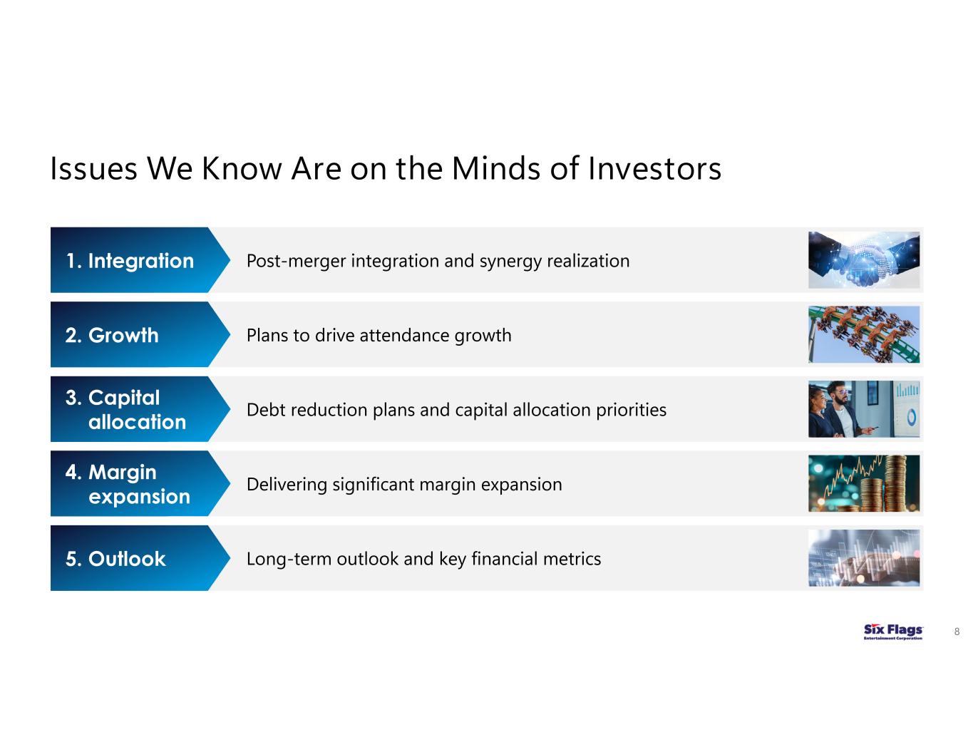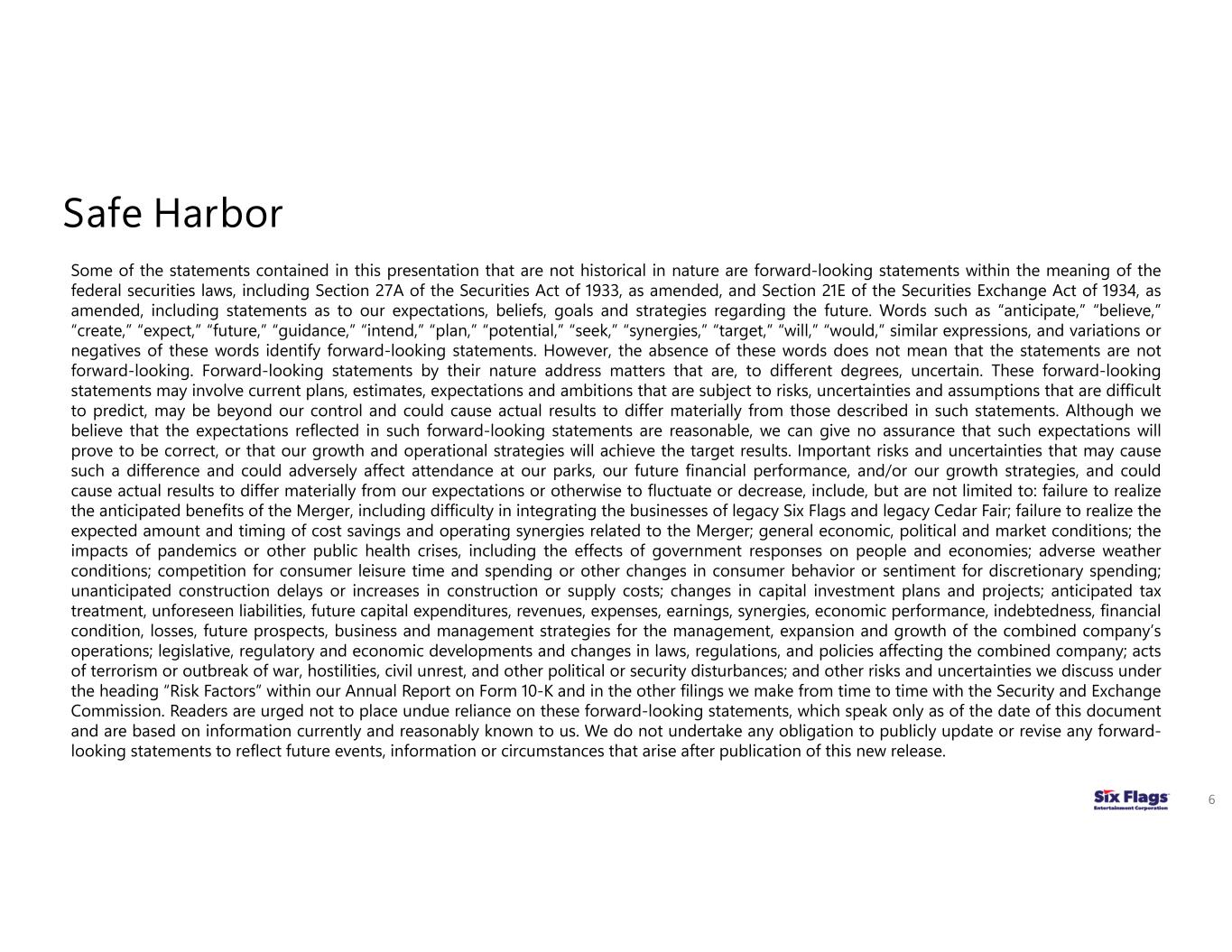 Safe Harbor 6 Some of the statements contained in this presentation that are not historical in nature are forward-looking statements within the meaning of the federal securities laws, including Section 27A of the Securities Act of 1933, as amended, and Section 21E of the Securities Exchange Act of 1934, as amended, including statements as to our expectations, beliefs, goals and strategies regarding the future. Words such as “anticipate,” “believe,” “create,” “expect,” “future,” “guidance,” “intend,” “plan,” “potential,” “seek,” “synergies,” “target,” “will,” “would,” similar expressions, and variations or negatives of these words identify forward-looking statements. However, the absence of these words does not mean that the statements are not forward-looking. Forward-looking statements by their nature address matters that are, to different degrees, uncertain. These forward-looking statements may involve current plans, estimates, expectations and ambitions that are subject to risks, uncertainties and assumptions that are difficult to predict, may be beyond our control and could cause actual results to differ materially from those described in such statements. Although we believe that the expectations reflected in such forward-looking statements are reasonable, we can give no assurance that such expectations will prove to be correct, or that our growth and operational strategies will achieve the target results. Important risks and uncertainties that may cause such a difference and could adversely affect attendance at our parks, our future financial performance, and/or our growth strategies, and could cause actual results to differ materially from our expectations or otherwise to fluctuate or decrease, include, but are not limited to: failure to realize the anticipated benefits of the Merger, including difficulty in integrating the businesses of legacy Six Flags and legacy Cedar Fair; failure to realize the expected amount and timing of cost savings and operating synergies related to the Merger; general economic, political and market conditions; the impacts of pandemics or other public health crises, including the effects of government responses on people and economies; adverse weather conditions; competition for consumer leisure time and spending or other changes in consumer behavior or sentiment for discretionary spending; unanticipated construction delays or increases in construction or supply costs; changes in capital investment plans and projects; anticipated tax treatment, unforeseen liabilities, future capital expenditures, revenues, expenses, earnings, synergies, economic performance, indebtedness, financial condition, losses, future prospects, business and management strategies for the management, expansion and growth of the combined company’s operations; legislative, regulatory and economic developments and changes in laws, regulations, and policies affecting the combined company; acts of terrorism or outbreak of war, hostilities, civil unrest, and other political or security disturbances; and other risks and uncertainties we discuss under the heading “Risk Factors” within our Annual Report on Form 10-K and in the other filings we make from time to time with the Security and Exchange Commission. Readers are urged not to place undue reliance on these forward-looking statements, which speak only as of the date of this document and are based on information currently and reasonably known to us. We do not undertake any obligation to publicly update or revise any forward- looking statements to reflect future events, information or circumstances that arise after publication of this new release.