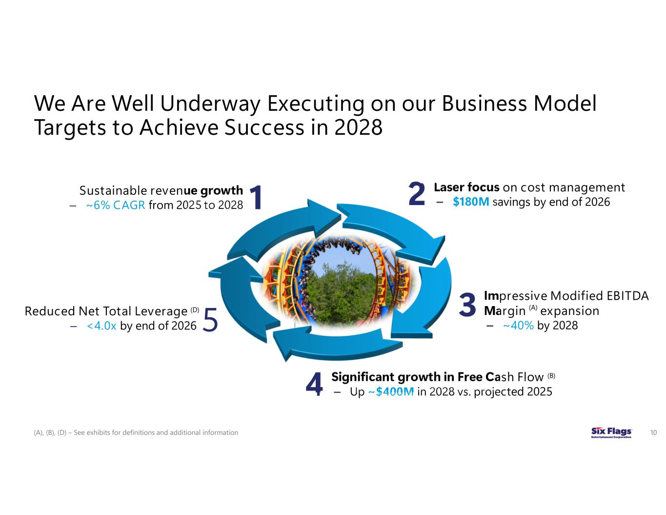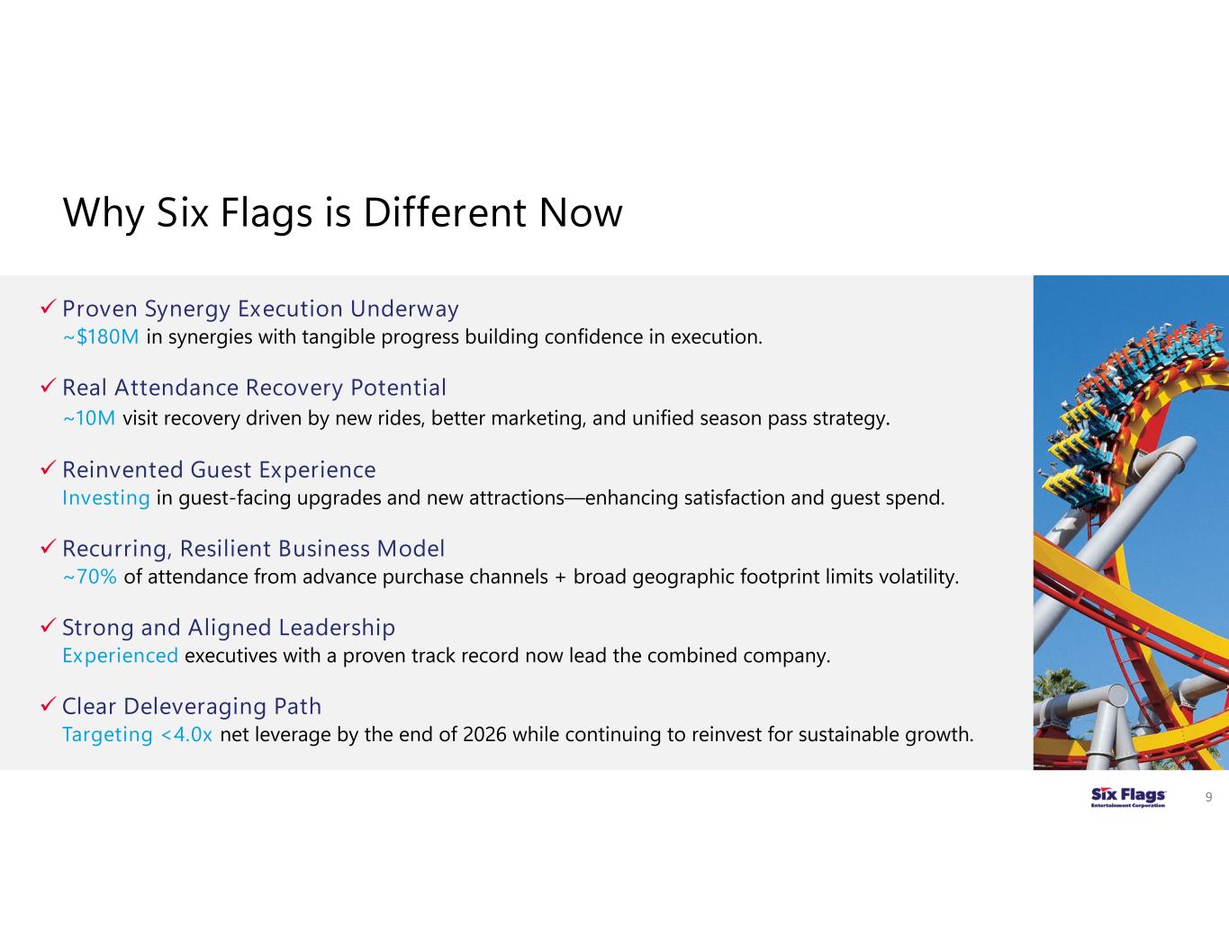 Why Six Flags is Different Now Proven Synergy Execution Underway ~$180M in synergies with tangible progress building confidence in execution. Real Attendance Recovery Potential ~10M visit recovery driven by new rides, better marketing, and unified season pass strategy. Reinvented Guest Experience Investing in guest-facing upgrades and new attractions—enhancing satisfaction and guest spend. Recurring, Resilient Business Model ~70% of attendance from advance purchase channels + broad geographic footprint limits volatility. Strong and Aligned Leadership Experienced executives with a proven track record now lead the combined company. Clear Deleveraging Path Targeting <4.0x net leverage by the end of 2026 while continuing to reinvest for sustainable growth. 9