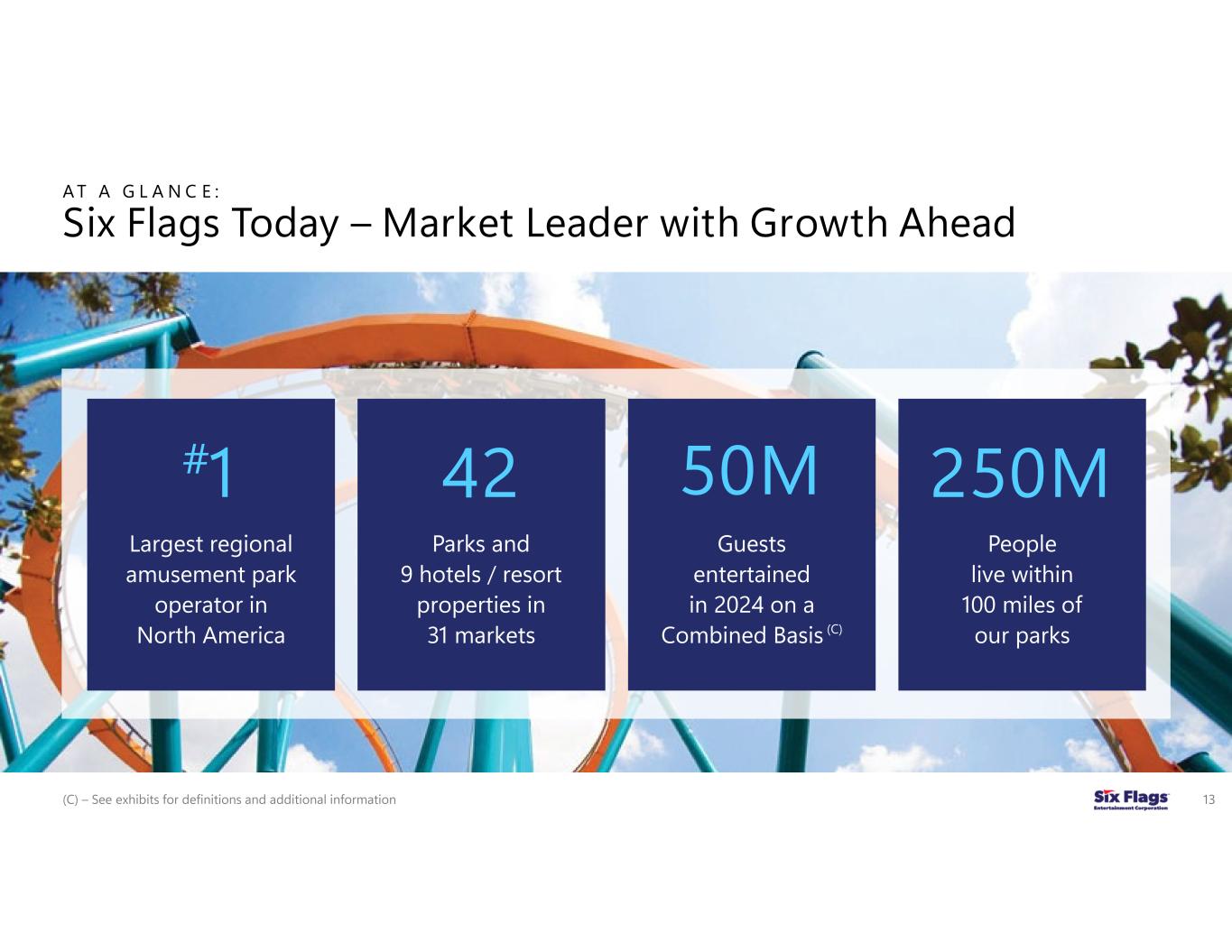 A T A G L A N C E : Six Flags Today – Market Leader with Growth Ahead #1 42 50M 250M Largest regional amusement park operator in North America Parks and 9 hotels / resort properties in 31 markets Guests entertained in 2024 on a Combined Basis (C) People live within 100 miles of our parks 13 (C) – See exhibits for definitions and additional information