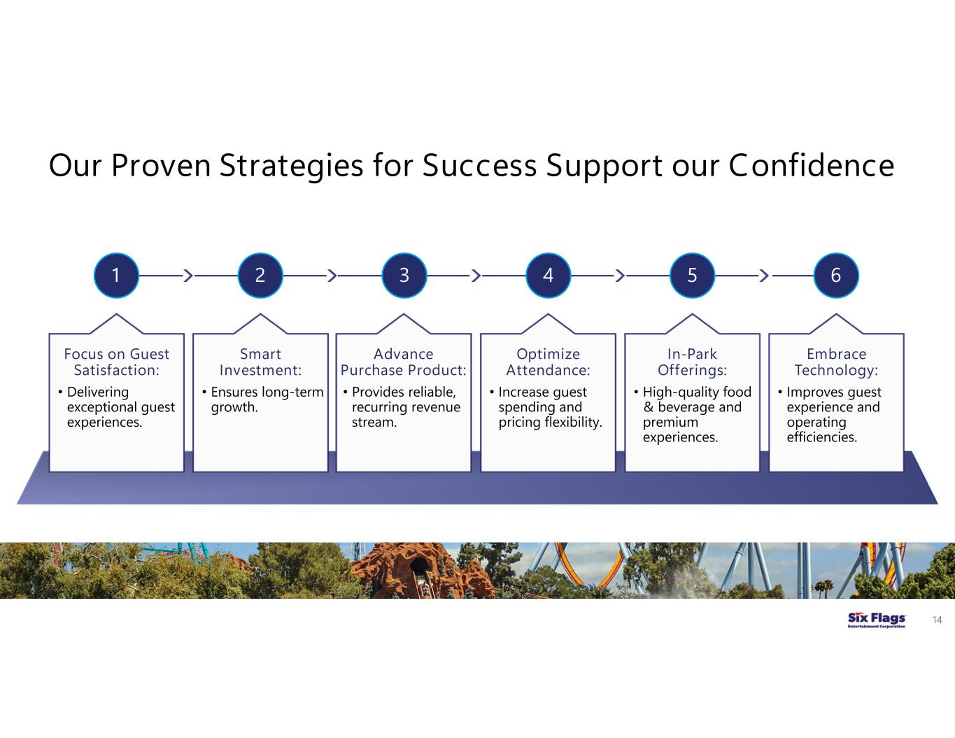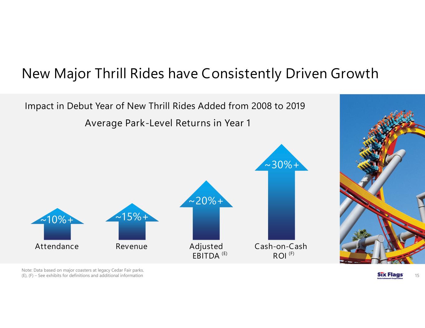 Our Proven Strategies for Success Support our Confidence 1 2 3 4 5 6 Focus on Guest Satisfaction: • Delivering exceptional guest experiences. Smart Investment: • Ensures long-term growth. Advance Purchase Product: • Provides reliable, recurring revenue stream. Optimize Attendance: • Increase guest spending and pricing flexibility. In-Park Offerings: • High-quality food & beverage and premium experiences. Embrace Technology: • Improves guest experience and operating efficiencies. 14