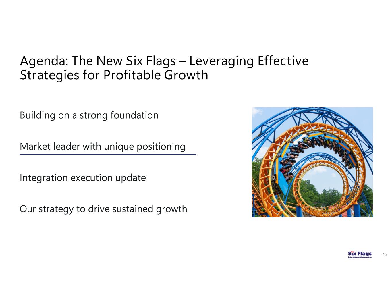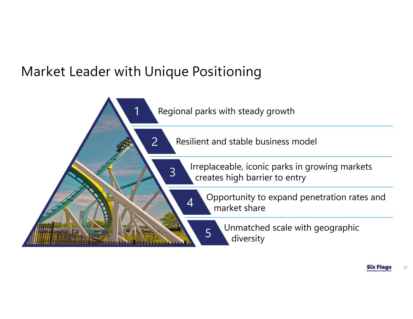 Agenda: The New Six Flags – Leveraging Effective Strategies for Profitable Growth 16 Market leader with unique positioning Our strategy to drive sustained growth Building on a strong foundation Integration execution update