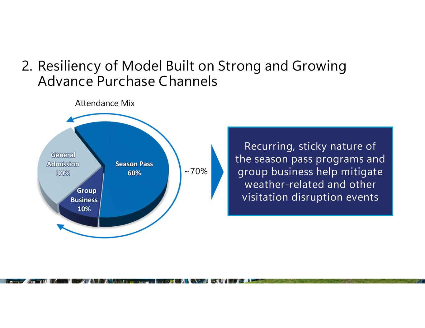 2. Resiliency of Model Built on Strong and Growing Advance Purchase Channels Recurring, sticky nature of the season pass programs and group business help mitigate weather-related and other visitation disruption events Season Pass 60% Group Business 10% General Admission 30% ~70% Attendance Mix 19
