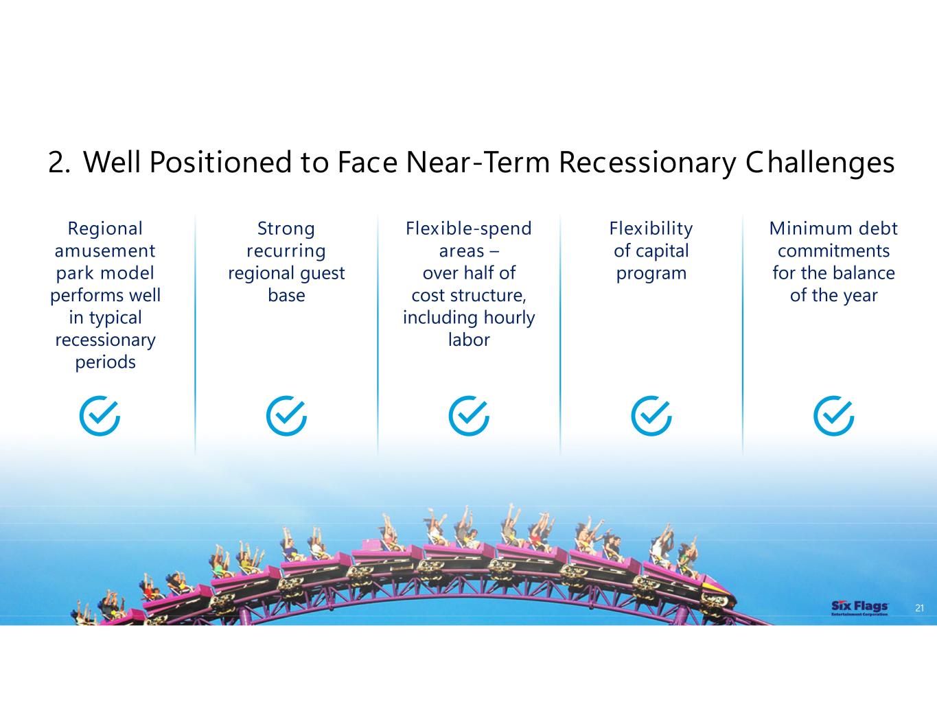 2. Well Positioned to Face Near-Term Recessionary Challenges 21 Regional amusement park model performs well in typical recessionary periods Strong recurring regional guest base Flexible-spend areas – over half of cost structure, including hourly labor Flexibility of capital program Minimum debt commitments for the balance of the year