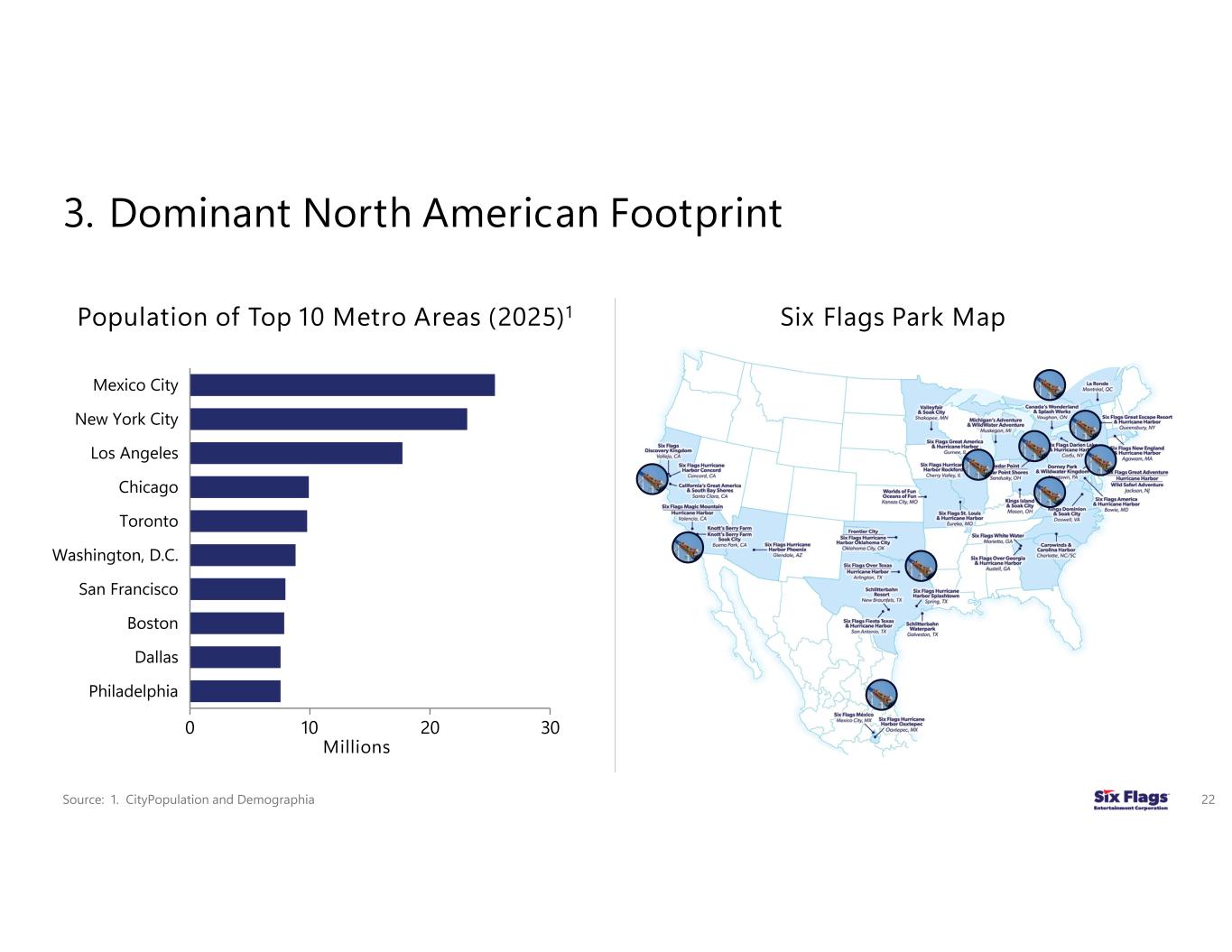 3. Dominant North American Footprint 22 0 10 20 30 Mexico City New York City Los Angeles Chicago Toronto Washington, D.C. San Francisco Boston Dallas Philadelphia Millions Population of Top 10 Metro Areas (2025)1 Six Flags Park Map Source: 1. CityPopulation and Demographia