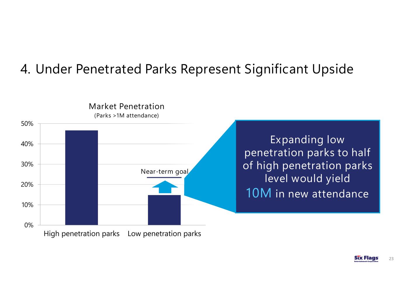 4. Under Penetrated Parks Represent Significant Upside 23 Expanding low penetration parks to half of high penetration parks level would yield 10M in new attendance 0% 10% 20% 30% 40% 50% High penetration parks Low penetration parks Market Penetration (Parks >1M attendance) Near-term goal