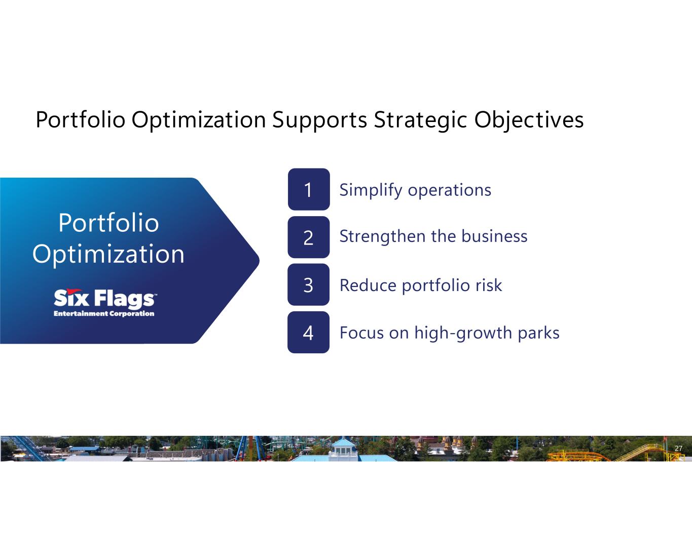 Portfolio Optimization Supports Strategic Objectives Portfolio Optimization 27 1 Strengthen the business 2 Reduce portfolio risk 3 Simplify operations 4 Focus on high-growth parks