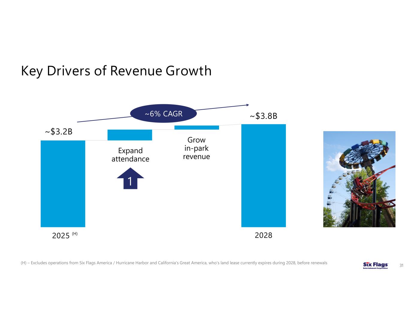 Key Drivers of Revenue Growth ~$3.2B ~$3.8B Expand attendance Grow in-park revenue ~6% CAGR 2025 (H) 2028 1 31 (H) – Excludes operations from Six Flags America / Hurricane Harbor and California’s Great America, who’s land lease currently expires during 2028, before renewals