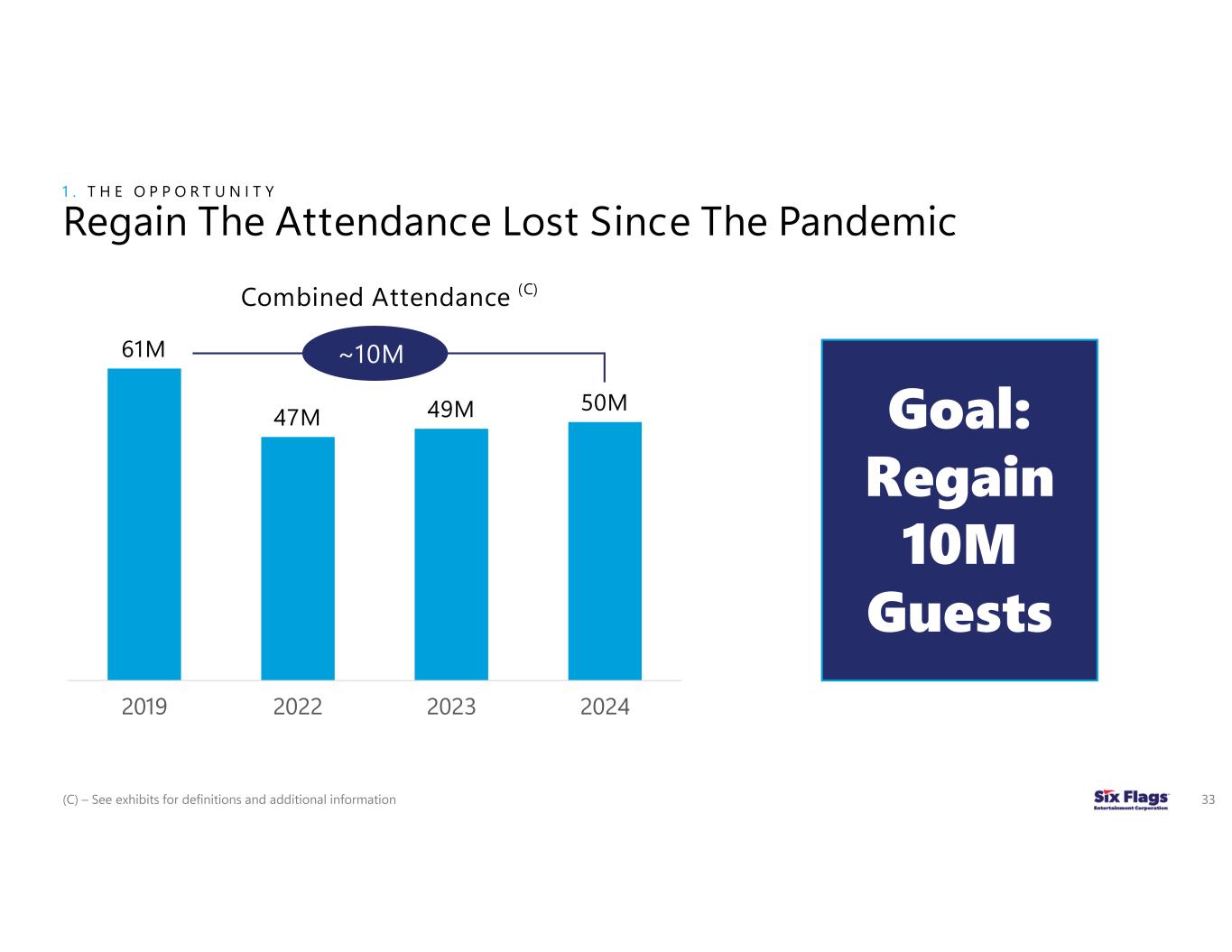 61M 47M 49M 50M 2019 2022 2023 2024 Goal: Regain 10M Guests Combined Attendance (C) ~10M 33 1 . T H E O P P O R T U N I T Y Regain The Attendance Lost Since The Pandemic (C) – See exhibits for definitions and additional information