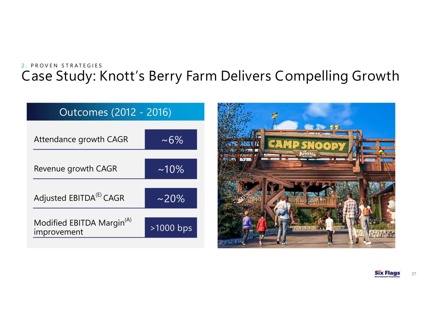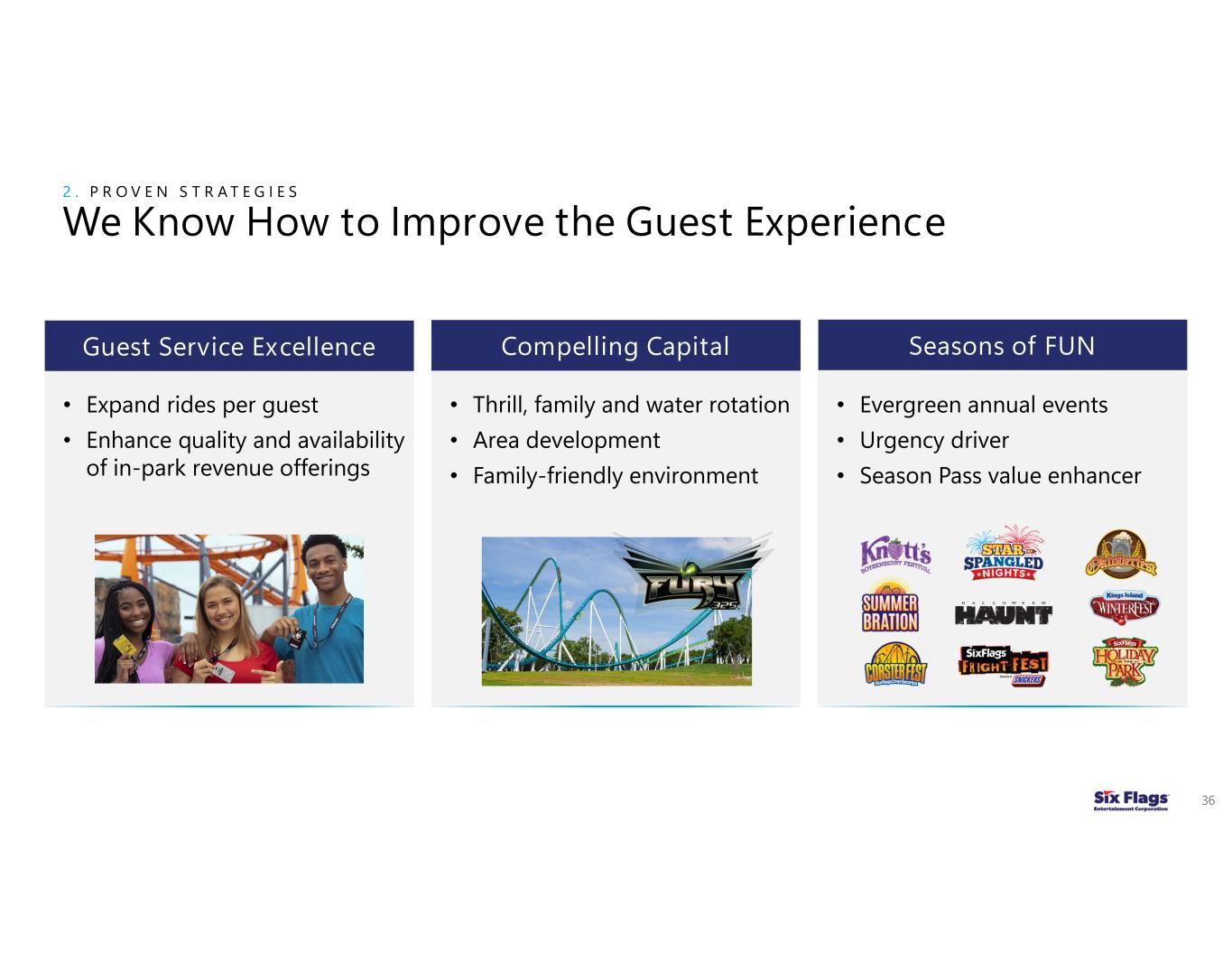 • Expand rides per guest • Enhance quality and availability of in-park revenue offerings Guest Service Excellence • Thrill, family and water rotation • Area development • Family-friendly environment Compelling Capital • Evergreen annual events • Urgency driver • Season Pass value enhancer Seasons of FUN 2 . P R O V E N S T R A T E G I E S We Know How to Improve the Guest Experience 36