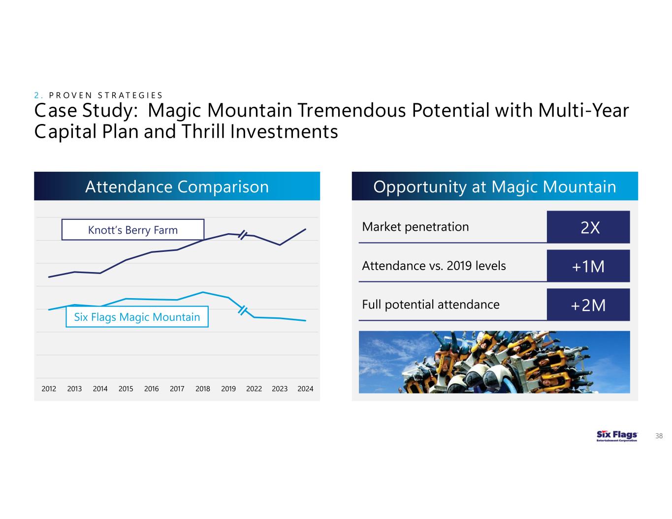 2 . P R O V E N S T R A T E G I E S Case Study: Magic Mountain Tremendous Potential with Multi-Year Capital Plan and Thrill Investments Opportunity at Magic Mountain 2X +1M +2M Attendance Comparison 2012 2013 2014 2015 2016 2017 2018 2019 2022 2023 2024 Knott’s Berry Farm Six Flags Magic Mountain Market penetration Attendance vs. 2019 levels Full potential attendance 38