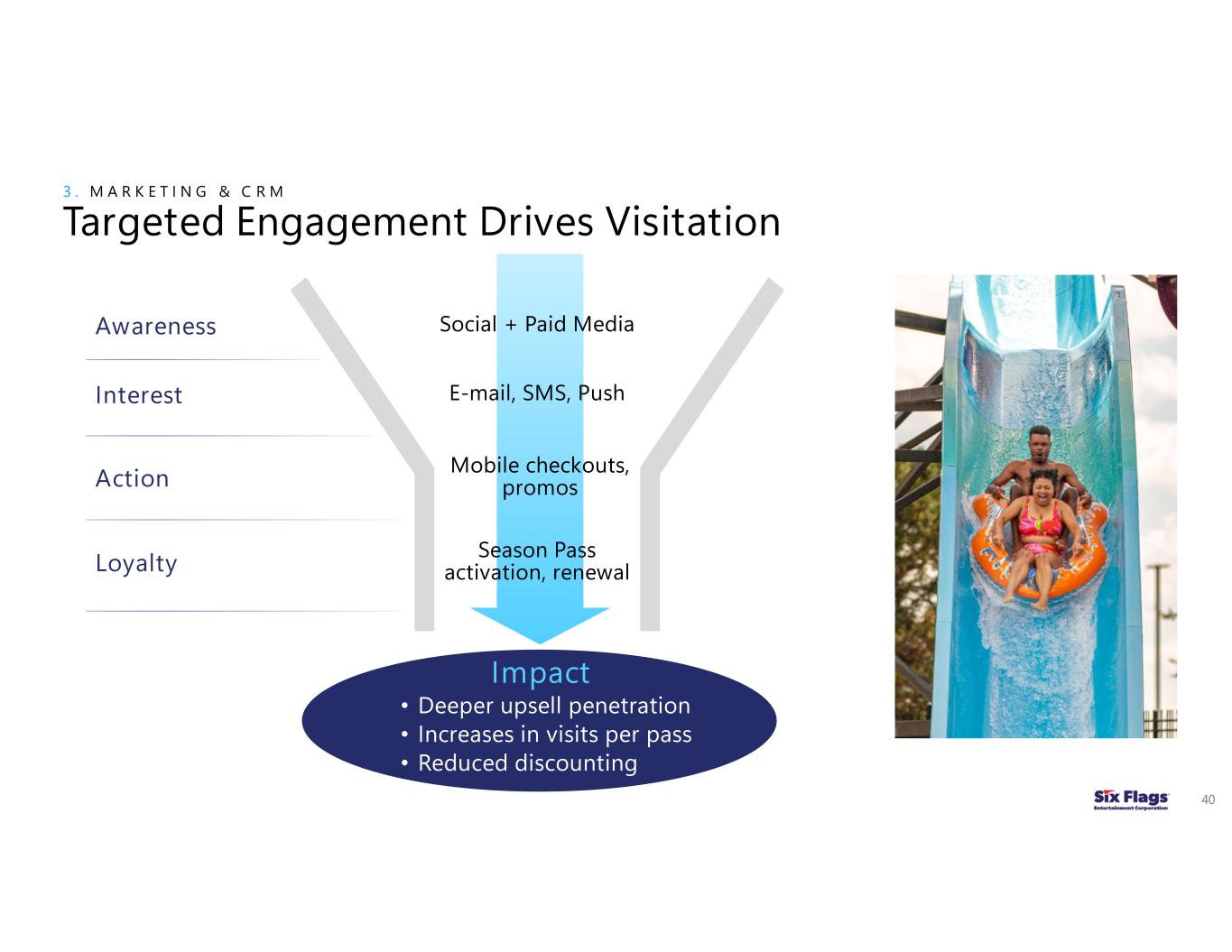40 Awareness Interest Action Loyalty Social + Paid Media E-mail, SMS, Push Mobile checkouts, promos Season Pass activation, renewal Impact • Deeper upsell penetration • Increases in visits per pass • Reduced discounting 3 . M A R K E T I N G & C R M Targeted Engagement Drives Visitation