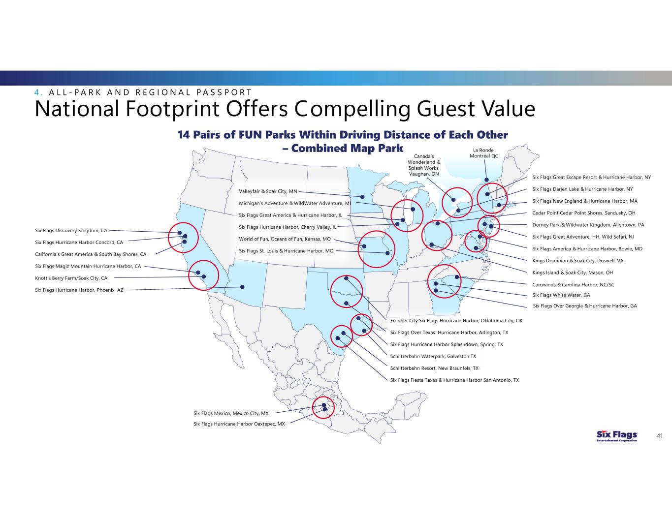 41 Six Flags Discovery Kingdom, CA Six Flags Hurricane Harbor Concord, CA California’s Great America & South Bay Shores, CA Six Flags Magic Mountain Hurricane Harbor, CA Knott’s Berry Farm/Soak City, CA Six Flags Hurricane Harbor, Phoenix, AZ Frontier City Six Flags Hurricane Harbor, Oklahoma City, OK Six Flags Over Texas Hurricane Harbor, Arlington, TX Six Flags Hurricane Harbor Splashdown, Spring, TX Schlitterbahn Waterpark, Galveston TX Schlitterbahn Resort, New Braunfels, TX Six Flags Fiesta Texas & Hurricane Harbor San Antonio, TX Valleyfair & Soak City, MN Michigan’s Adventure & WildWater Adventure, MI Six Flags Great America & Hurricane Harbor, IL Six Flags Hurricane Harbor, Cherry Valley, IL World of Fun, Oceans of Fun, Kansas, MO Six Flags St. Louis & Hurricane Harbor, MO Canada’s Wonderland & Splash Works, Vaughan, ON La Ronde, Montréal QC Six Flags Great Escape Resort & Hurricane Harbor, NY Six Flags Darien Lake & Hurricane Harbor, NY Six Flags New England & Hurricane Harbor, MA Cedar Point Cedar Point Shores, Sandusky, OH Dorney Park & Wildwater Kingdom, Allentown, PA Six Flags Great Adventure, HH, Wild Safari, NJ Six Flags America & Hurricane Harbor, Bowie, MD Kings Dominion & Soak City, Doswell, VA Kings Island & Soak City, Mason, OH Six Flags White Water, GA Six Flags Over Georgia & Hurricane Harbor, GA Carowinds & Carolina Harbor, NC/SC Six Flags Mexico, Mexico City, MX Six Flags Hurricane Harbor Oaxtepec, MX 14 Pairs of FUN Parks Within Driving Distance of Each Other – Combined Map Park 4 . A L L - P A R K A N D R E G I O N A L P A S S P O R T National Footprint Offers Compelling Guest Value