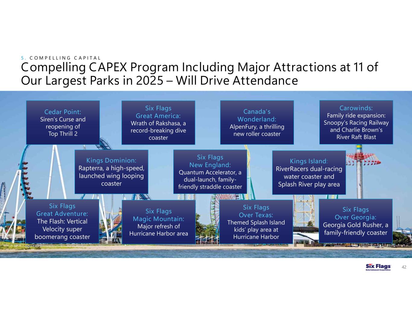 5 . C O M P E L L I N G C A P I T A L Compelling CAPEX Program Including Major Attractions at 11 of Our Largest Parks in 2025 – Will Drive Attendance 42 Cedar Point: Siren’s Curse and reopening of Top Thrill 2 Six Flags Great America: Wrath of Rakshasa, a record-breaking dive coaster Canada’s Wonderland: AlpenFury, a thrilling new roller coaster Six Flags New England: Quantum Accelerator, a dual-launch, family- friendly straddle coaster Carowinds: Family ride expansion: Snoopy’s Racing Railway and Charlie Brown’s River Raft Blast Kings Dominion: Rapterra, a high-speed, launched wing looping coaster Kings Island: RiverRacers dual-racing water coaster and Splash River play area Six Flags Magic Mountain: Major refresh of Hurricane Harbor area Six Flags Great Adventure: The Flash: Vertical Velocity super boomerang coaster Six Flags Over Texas: Themed Splash Island kids’ play area at Hurricane Harbor Six Flags Over Georgia: Georgia Gold Rusher, a family-friendly coaster