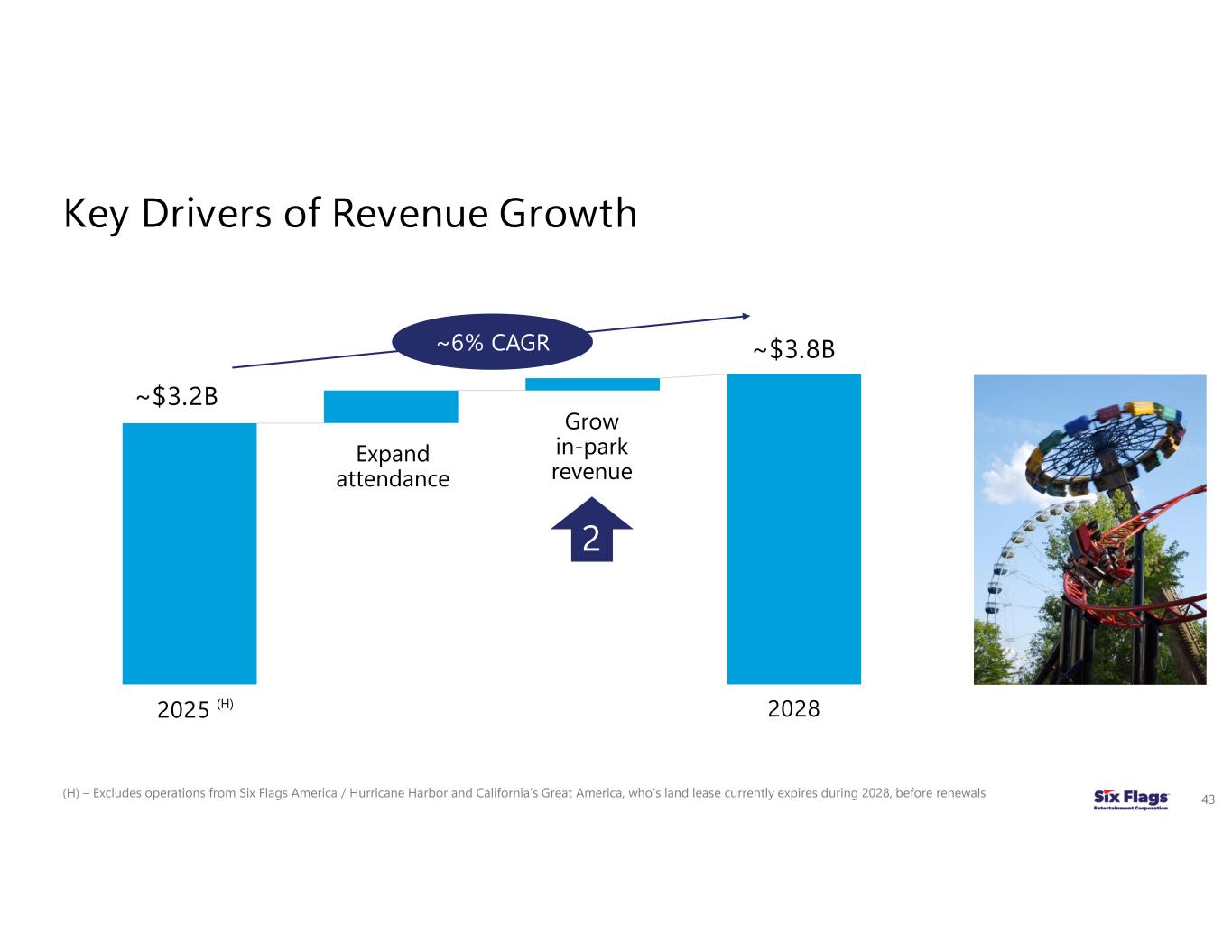 Key Drivers of Revenue Growth ~$3.2B ~$3.8B Expand attendance Grow in-park revenue ~6% CAGR 2025 (H) 2028 2 43 (H) – Excludes operations from Six Flags America / Hurricane Harbor and California’s Great America, who’s land lease currently expires during 2028, before renewals