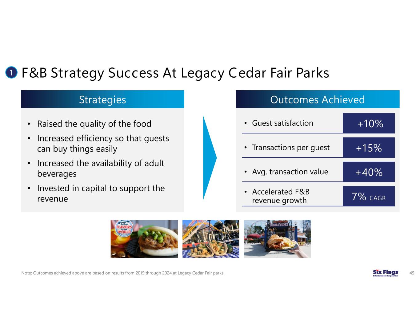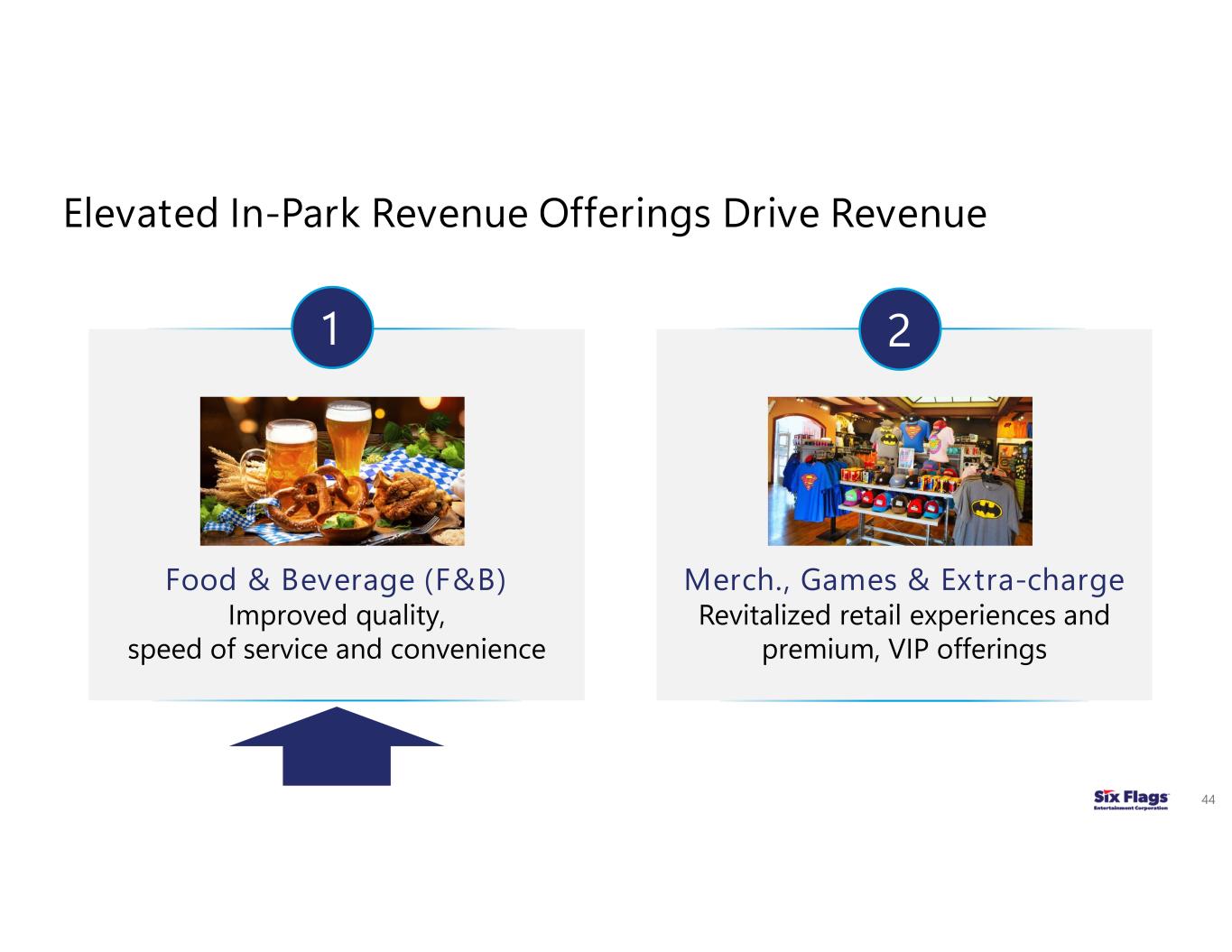 Food & Beverage (F&B) Improved quality, speed of service and convenience Merch., Games & Extra-charge Revitalized retail experiences and premium, VIP offerings Elevated In-Park Revenue Offerings Drive Revenue 44 1 2