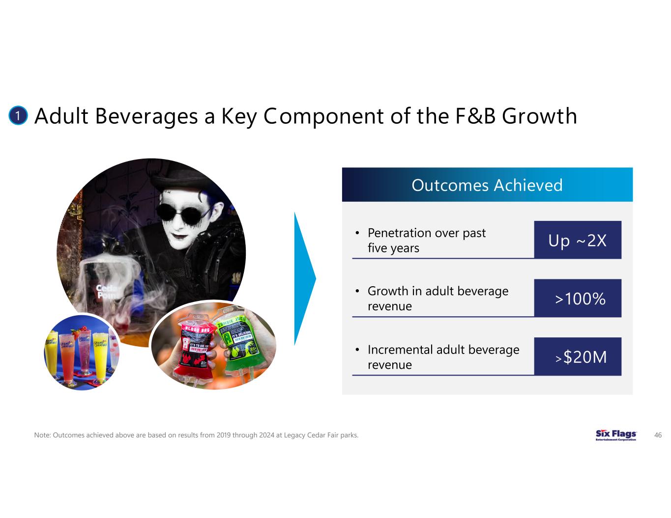 Strategies • Raised the quality of the food • Increased efficiency so that guests can buy things easily • Increased the availability of adult beverages • Invested in capital to support the revenue Outcomes Achieved F&B Strategy Success At Legacy Cedar Fair Parks 45 1 • Guest satisfaction +10% +15% • Transactions per guest +40% • Avg. transaction value 7% CAGR • Accelerated F&B revenue growth Note: Outcomes achieved above are based on results from 2015 through 2024 at Legacy Cedar Fair parks.