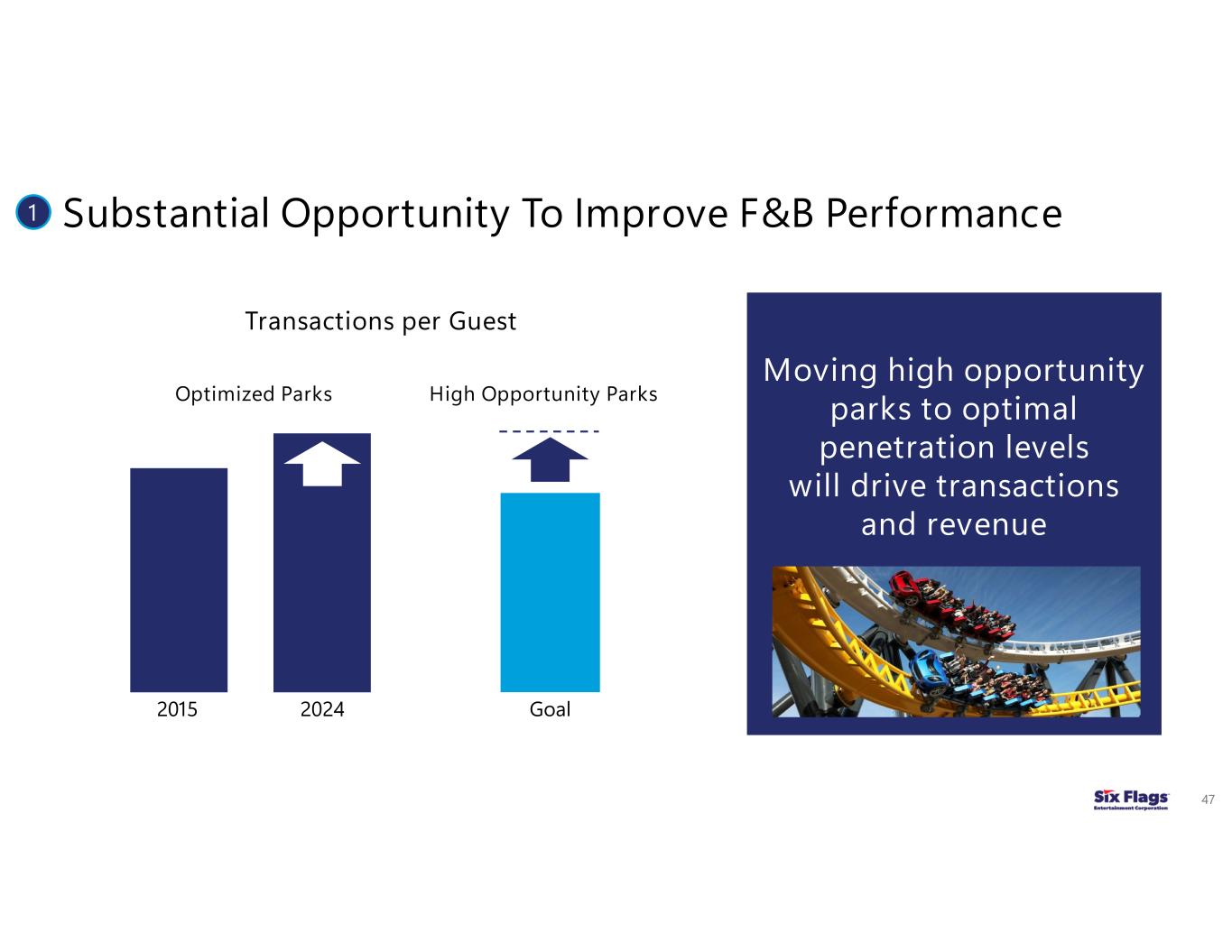Transactions per Guest Substantial Opportunity To Improve F&B Performance Goal Moving high opportunity parks to optimal penetration levels will drive transactions and revenue 2015 Optimized Parks High Opportunity Parks 2024 47 1