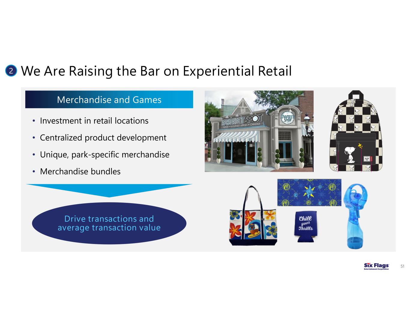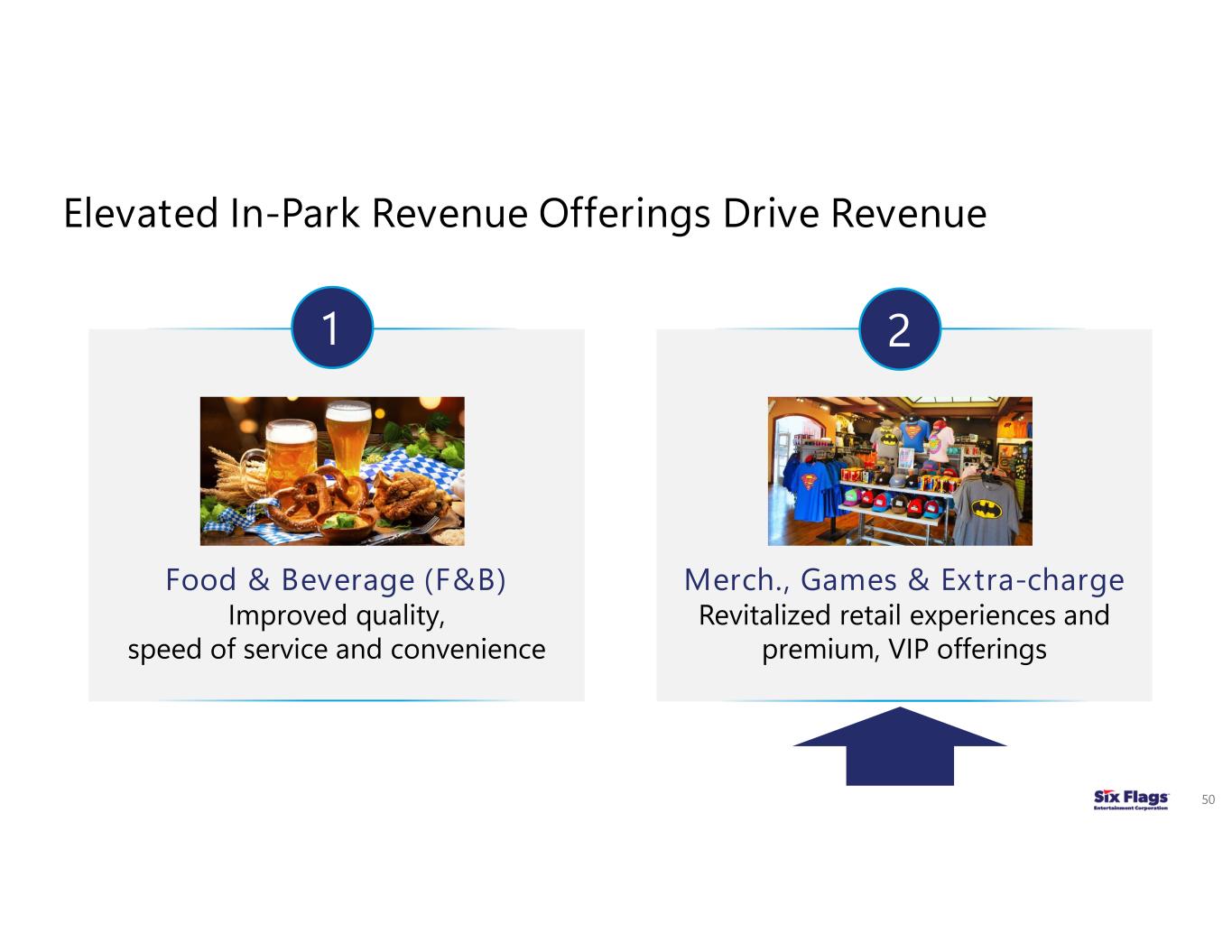 Food & Beverage (F&B) Improved quality, speed of service and convenience Merch., Games & Extra-charge Revitalized retail experiences and premium, VIP offerings Elevated In-Park Revenue Offerings Drive Revenue 50 1 2