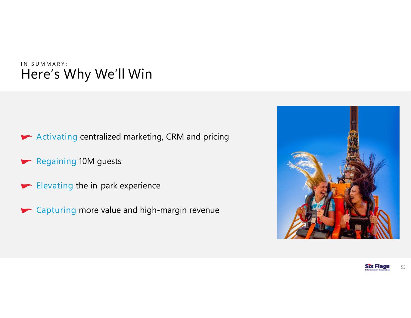 I N S U M M A R Y : Here’s Why We’ll Win Activating centralized marketing, CRM and pricing Regaining 10M guests Elevating the in-park experience Capturing more value and high-margin revenue 53
