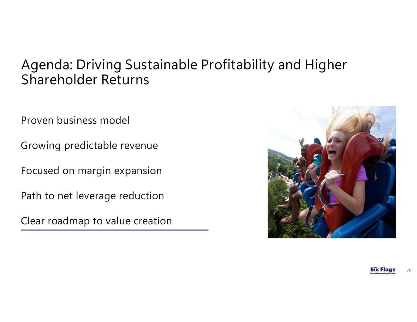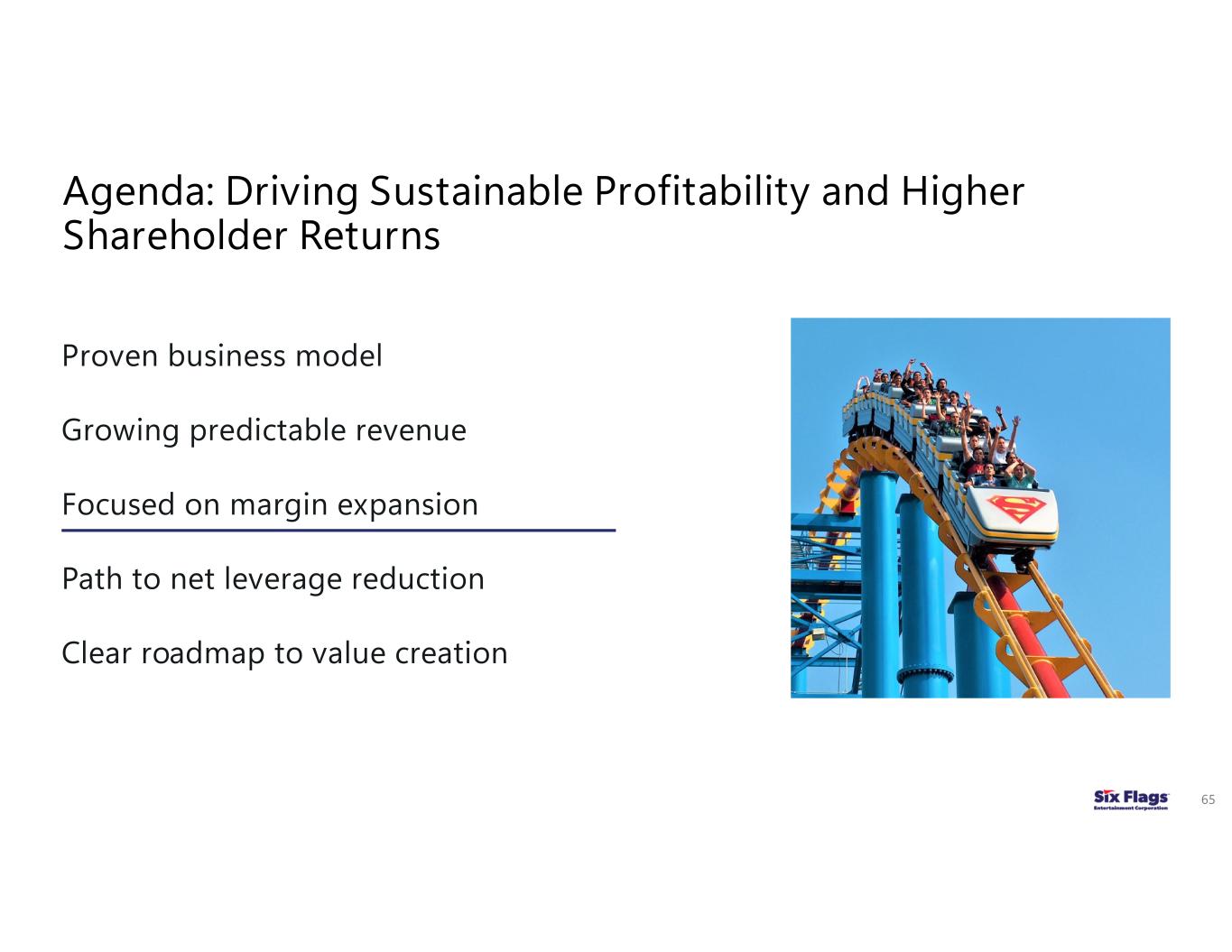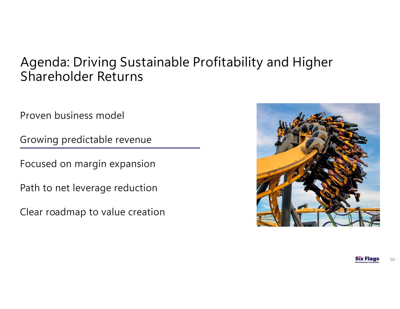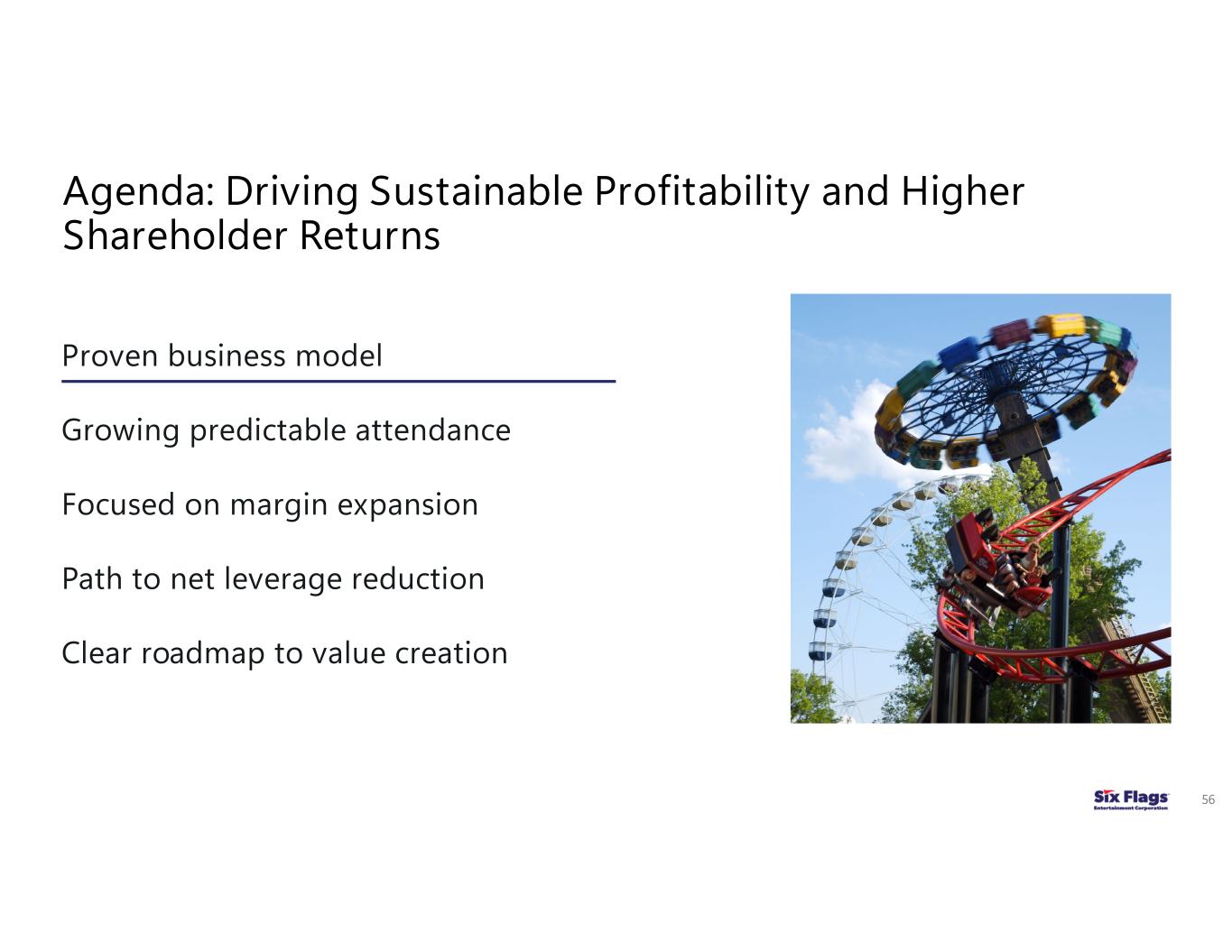 Agenda: Driving Sustainable Profitability and Higher Shareholder Returns 56 Proven business model Growing predictable attendance Focused on margin expansion Path to net leverage reduction Clear roadmap to value creation